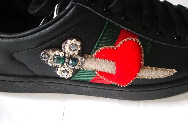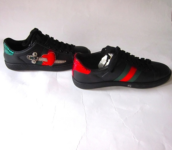 黒に赤とグリーンのハートに刺さった剣のビジューのデザインのスニーカー。