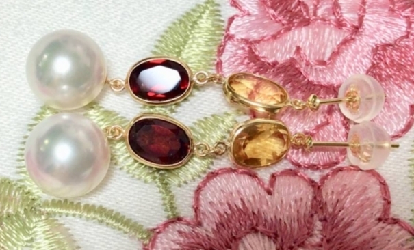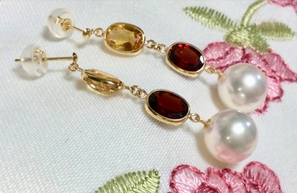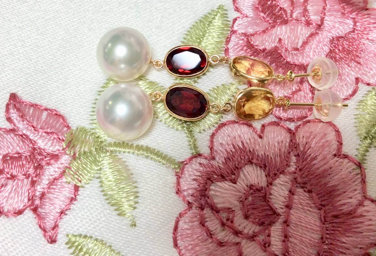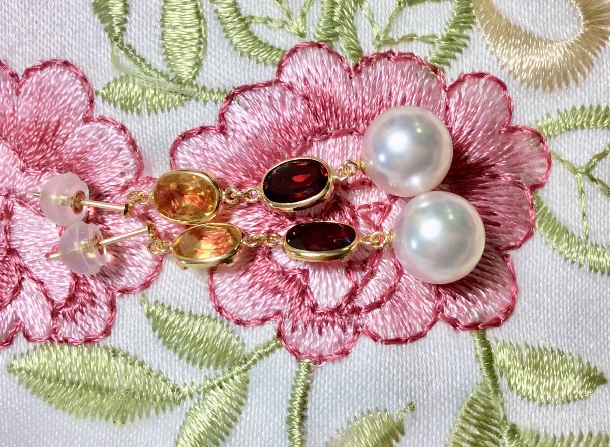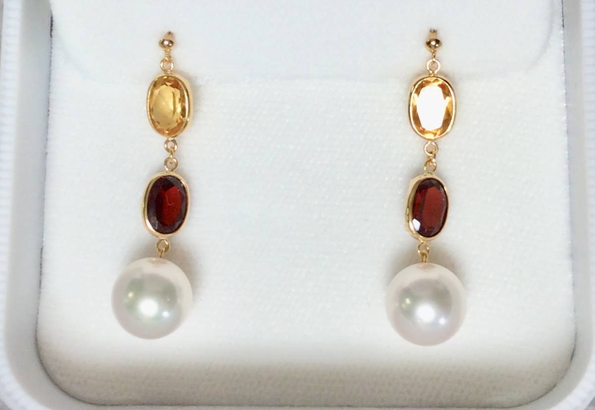花珠 8.9mm アコヤ 真珠 ピアス ロングピアス 天然石 シトリン ガーネット 本真珠 ソーティング付 未使用品