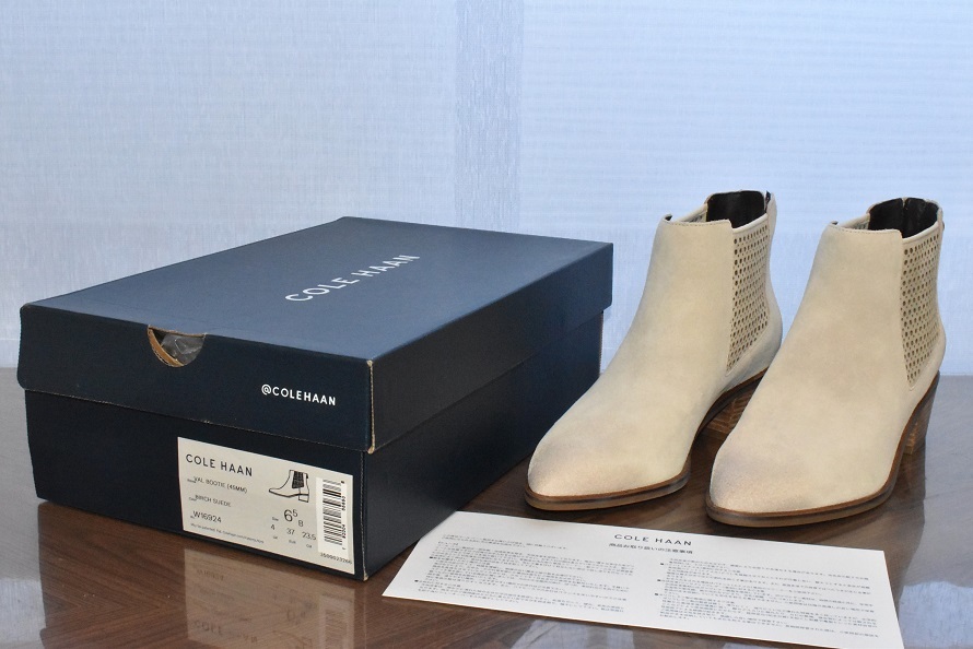 メイドインヴェトナム(表記あり)、表記サイズは23.5cm、素人採寸ですがソール長約25cm、ソール幅約8.5cm(最長部計測)、ヒール高約4.5cm、筒高約11cm、素材はスウェードレザー、ラバーなど、専用箱付き未使用、購入時の定価5万3900円(表紀なし https://www.colehaan.co.jp/outlet/outlet-womens/outlet-womens-shoes/outlet-womens-shoes-boots/W16924.html 公式参照)、写真撮影などのために数回専用箱から出しています。