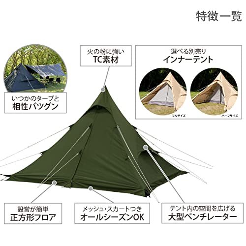「DOD(ディーオーディー) ワンポールテントRX(M) TC【1~4人用】 スカート付き TCフライ T3-949-KH」▼4580742232984▼(商品説明)TCポリコットン・カーキ (約)W300×D300×H210cm ・・Color:カーキStyle:TCポリコットンPatternName:単品・サイズ:(約)W300×D300×H210cm・パッケージ重量: 9.38 kg・形: 三角形・素材: ポリコットン説明 設営のシンプルさを突き詰めたワンポールテント究極形 大好きだったヒーローが、強くなるたびに形態を変え、体中に余計な物がついて好きじゃなくなる。 全部乗せな最終回の姿にがっかりしつつも、それで強くなるのならと自分を納得させて生きてきました。 しかし、お待ちなさい! 真の強者は、ゴテゴテなどしていないのですよ。 さぁ、ご覧に入れましょう!DODの考えるワンポールテントの最終形態を。
