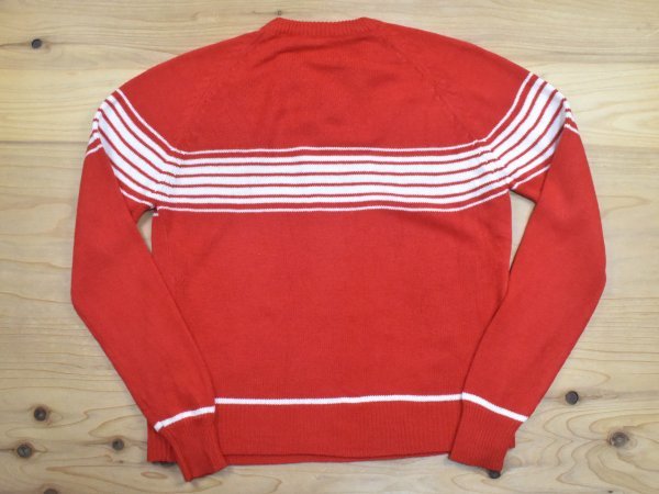 白いラインの入ったレトロなデザインのVネックセーターで、袖はラグランスリーブです。