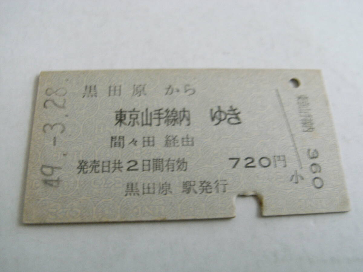 東北本線 黒田原から東京山手線内ゆき 間々田経由 昭和49年3月28日 黒田原駅発行