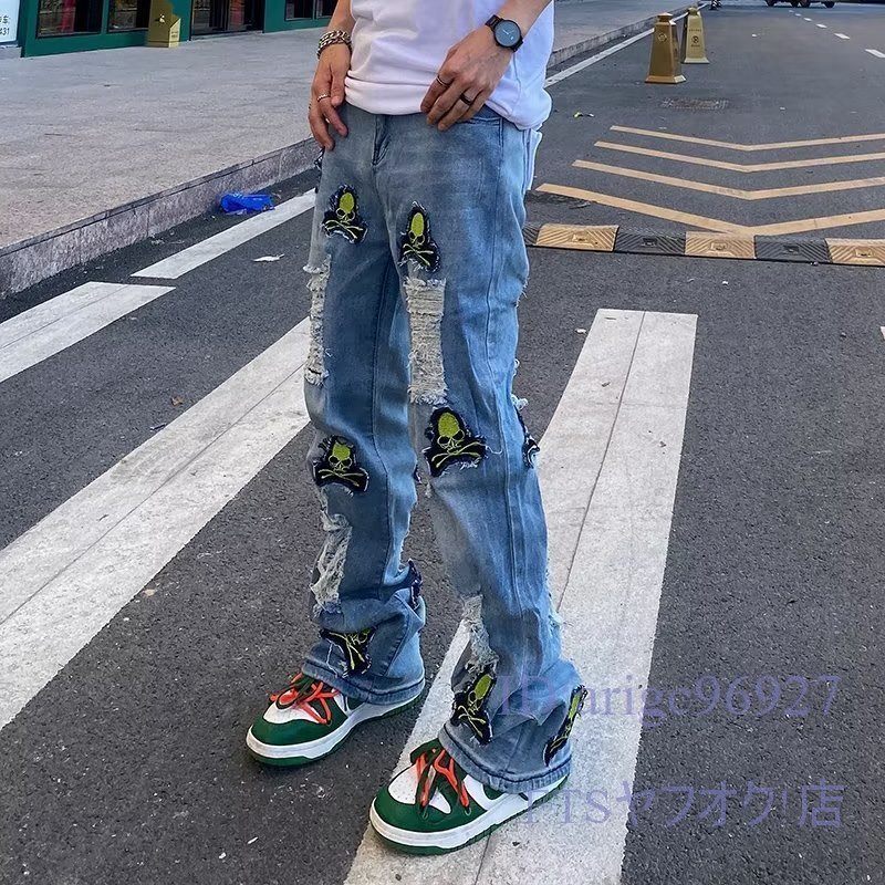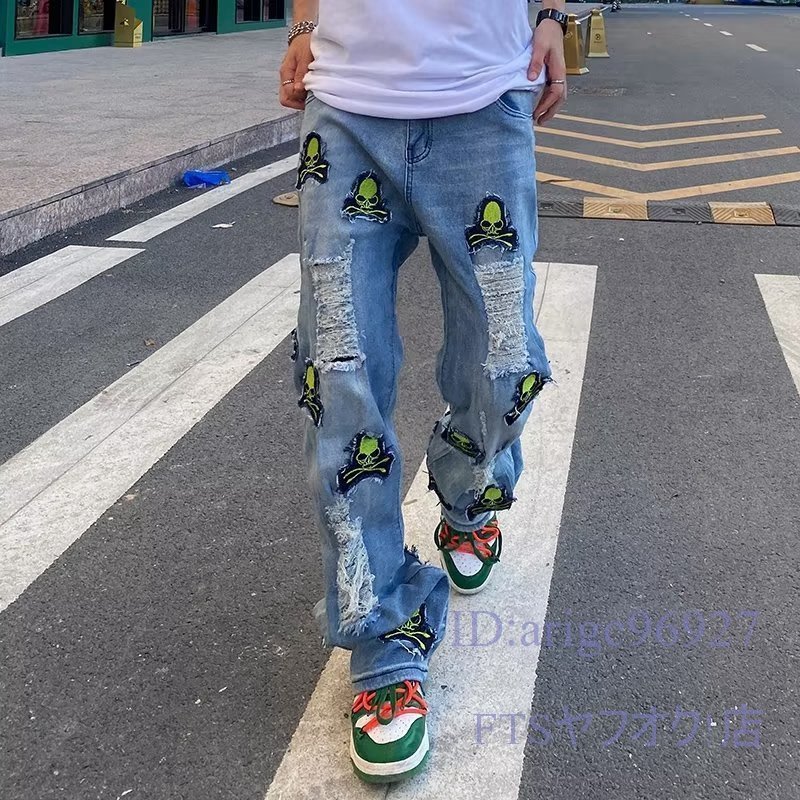S654☆新品メンズ デニムパンツ ジーンズ ワイドパンツ ハロンパンツ ヒップホップ スタイル ジーパン 刺繍 ゆったり ブルー S~4XL