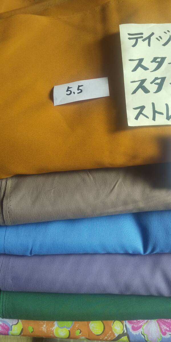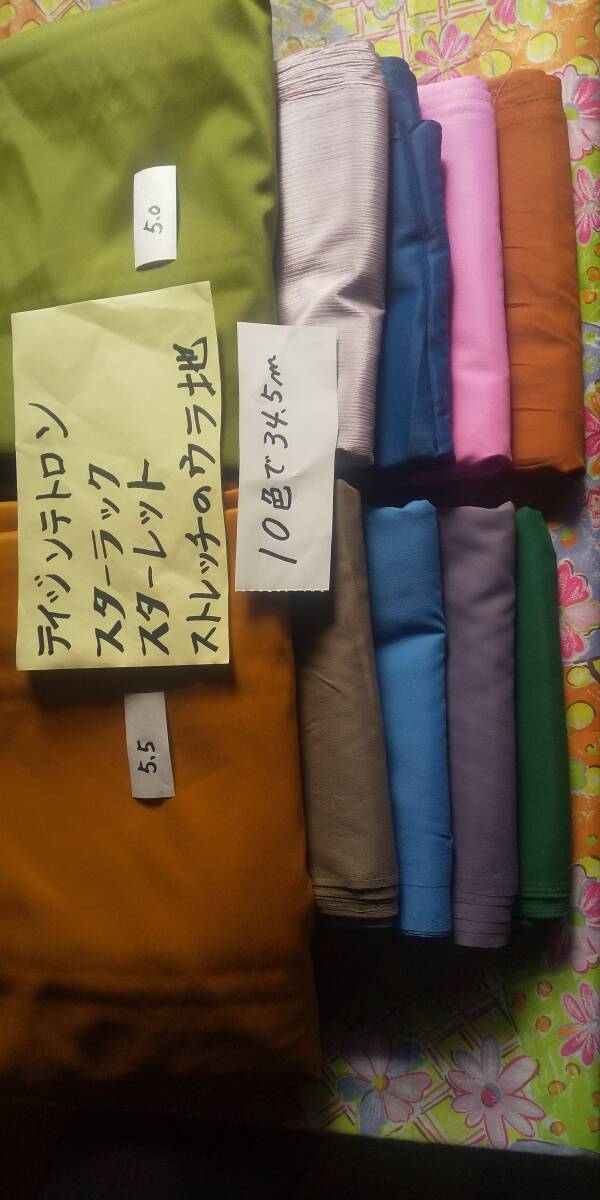 ストレッチの裏地 スターラック、スターレット等 8色各3m 1色5m 1色5.5m 合計34.5m 未使用ですが、在庫品のため難あるかもわかりませんので、完品をお求めの方や神経質の方はご遠慮ください。また、写真の撮り方が未熟なために色合いや質感が実物と違う場合がありますので、まえもって、ご了承の上、入札頂きますように、お願い申しあげます。評価不要の場合は最初にその旨をお知らせくださるようにお願いいたします。お知らせのない場合はこちら、発送時に評価させて頂きます。