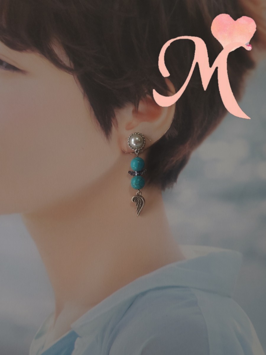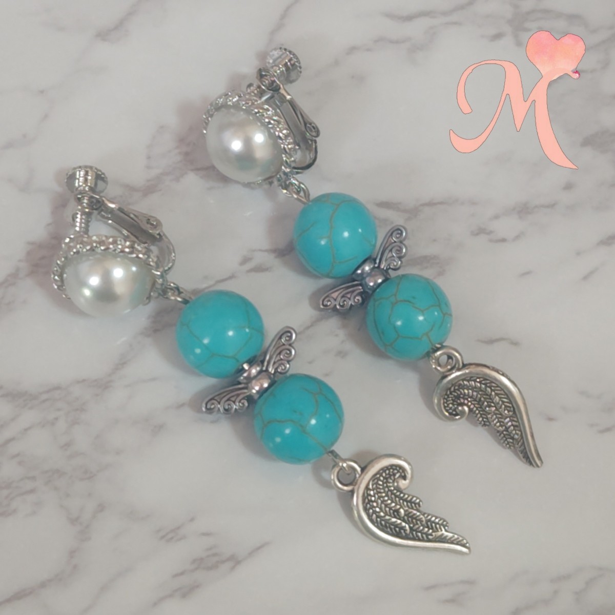 ハンドメイド イヤリング or ピアス ツイストパール ニッケルフリー 変退色防止加工済 アレルギー対応 ターコイズ 羽