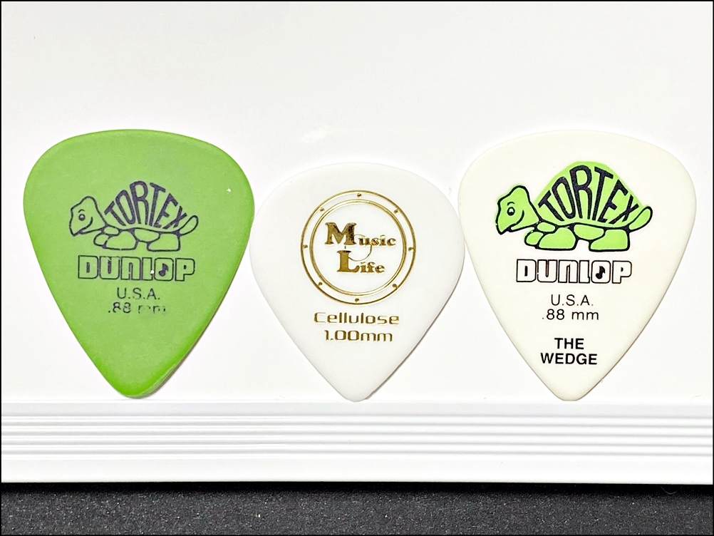 程よい小ぶりのサイズで単音の速弾きもしやすく、コード弾きもしやすいのが特徴。 カッティングもやりやすいバランスの取れたピックです。