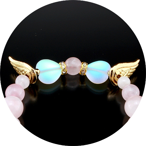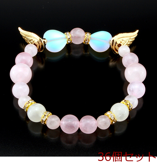 「ジュエリー品質保証書」付き 幸運が舞い降りる「天使の羽」 上品で可愛らしい雰囲気のブレスレット ハート型の「ルナフラッシュ」が可愛さをプラス ・女性らしいカラーのパワーストーンとゴールドの組み合わせ ・ローズクォーツ×ルナフラッシュ×ムーンストーン 「ピンク」「ペールブルー」「メローホワイト」のやさしい色合い ローズクォーツは愛と美の女神であるアフロディーテを象徴する石といわれ、恋愛や癒しの石として人気があります。 恋愛はもちろんのこと、持ち主の感情を安定させるともいわれています。 そしてムーンストーンは女性の象徴とされている「月」との関わりが深いといわれ、神秘的なエネルギーを宿す石として古来より人々に愛されてきました。 とくに女性をサポートするパワーにあふれているといわれています。 不安定な感情を穏やかに鎮め、やさしい気持ちにしてくれるそうです。 またインスピレーションを高め、感受性を豊かにするといわれています。 羽パーツ2個(20×10mm 真鍮)、ルナフラッシュ2個(12×12mmハートカット)、ローズクォーツ2個(10mm珠)、7個(8mm珠)、6個(6mm珠)、ムーンストーン2個(8mm珠)、ロンデル6個(6×3mm 真鍮/ラインストーン)、樹脂ボール2個(3mm)[サイズ]約17cm(内周)[重量]約22g[中糸]ポリウレタンゴム[付属品]専用巾着袋、ジュエリー品質保証書[個装サイズ]縦15.8×横10.0×高さ2.0(cm)/32(g) |