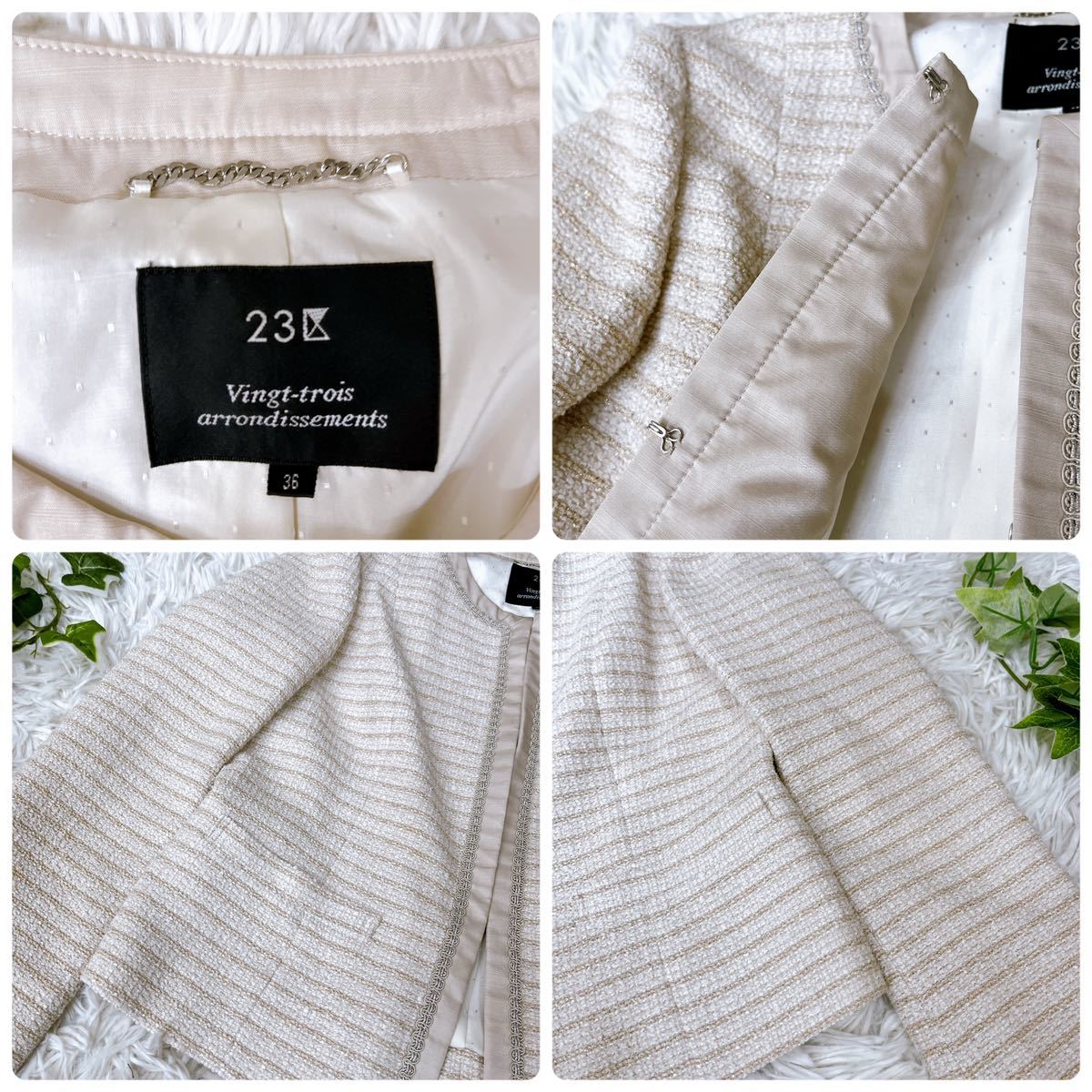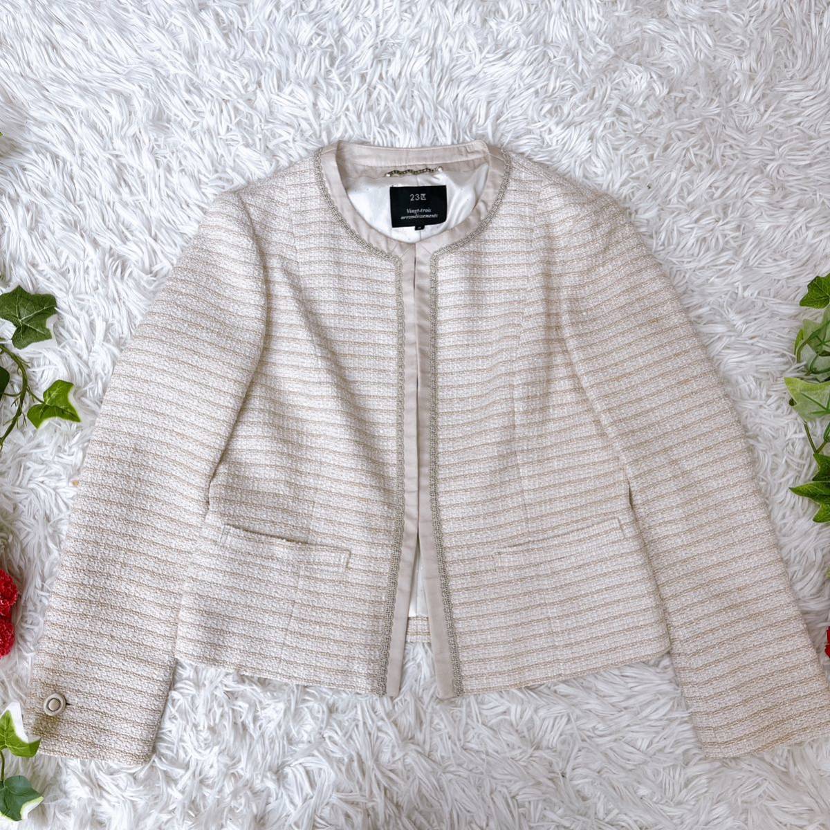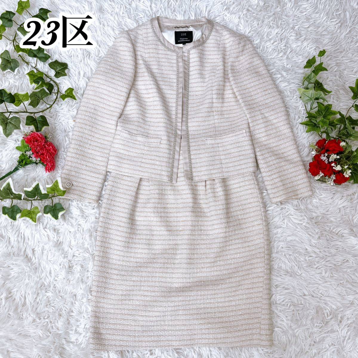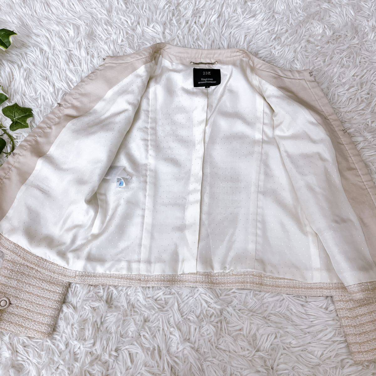23区ツイードセットアップスカートスーツ上下 サイズ36 サイズ38 ベージュラメ入り ママスーツ ノーカラー ジャケット