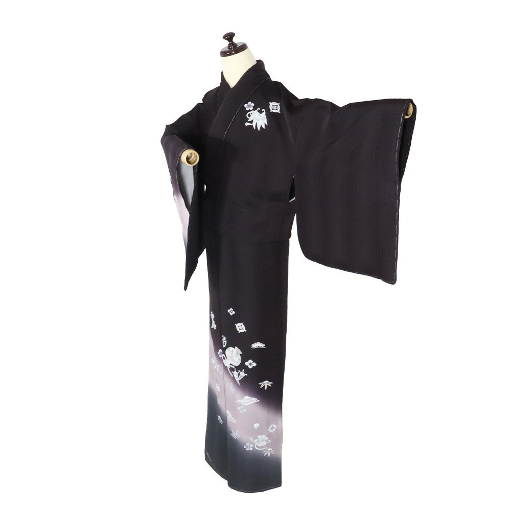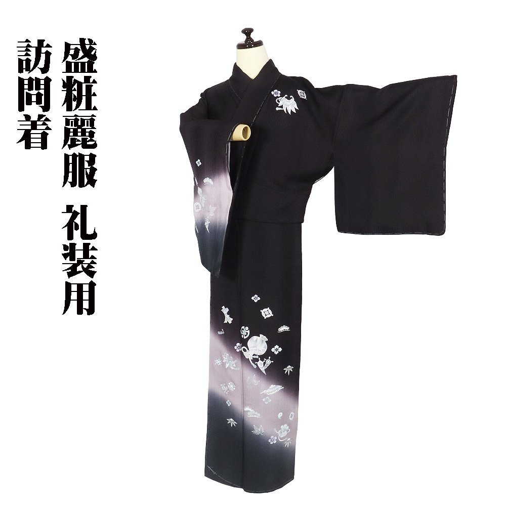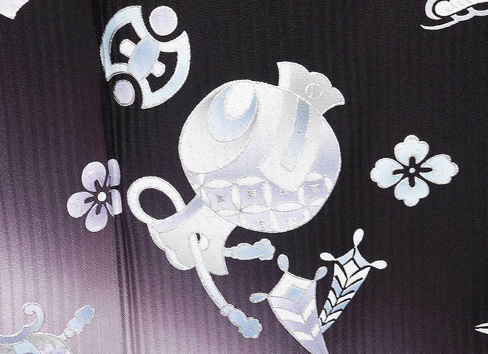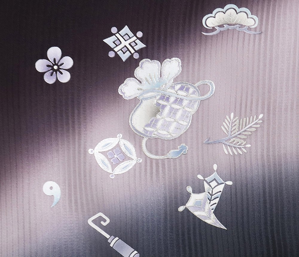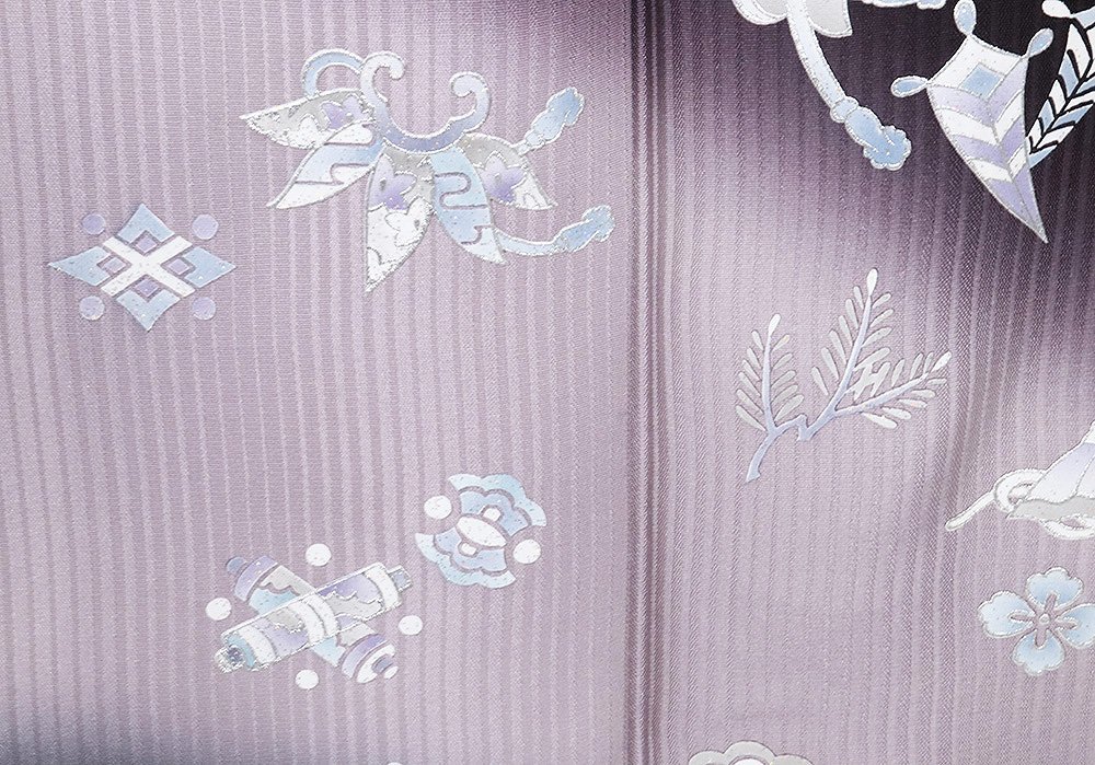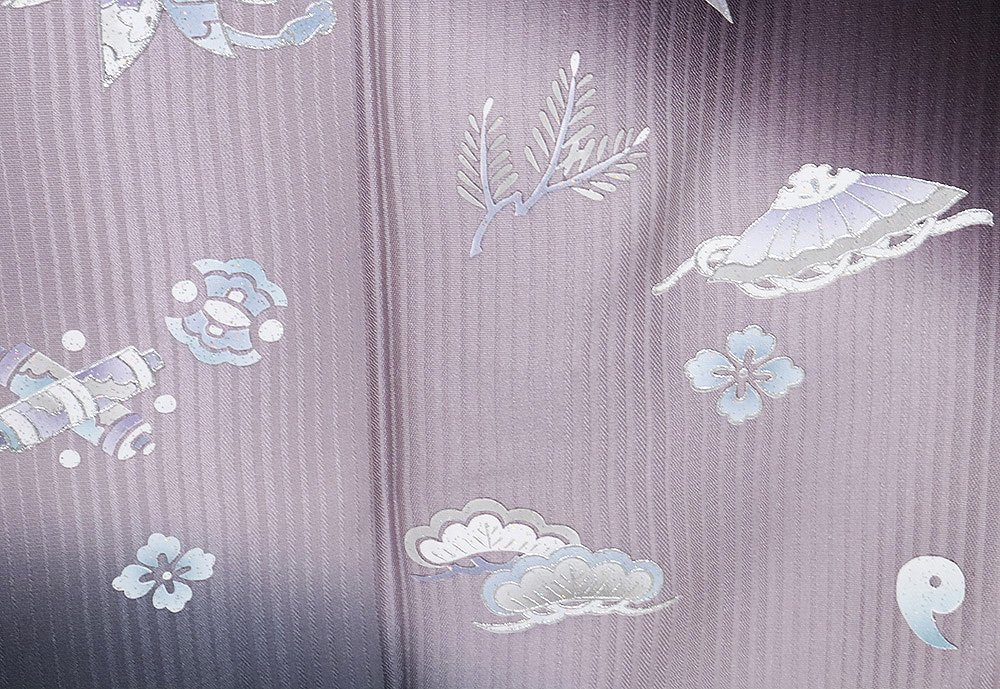 | 色・柄 | 訪問着 袷 丹後縮緬地 濃い紫・ピンク・グレー暈し・縦縞地 箔彩・宝尽くし・松竹梅 (写真では上手く色が出ない場合があります。ご了承下さい) |