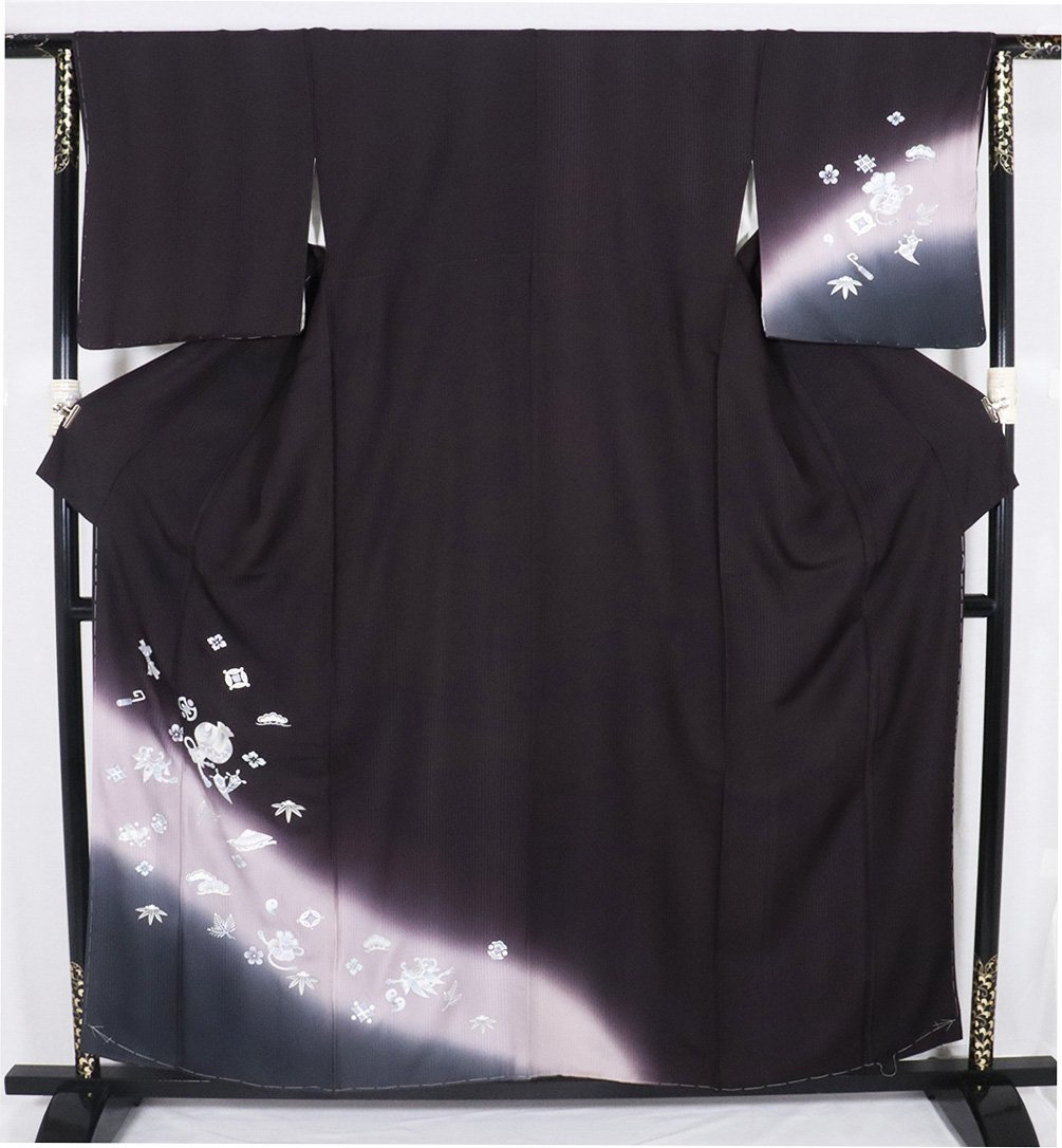| 訪問着 袷 丹後縮緬地 濃い紫・ピンク・グレー暈し・縦縞地 箔彩・宝尽くし・松竹梅 165 広襟 新品 仕付け付き | |
