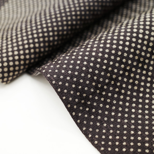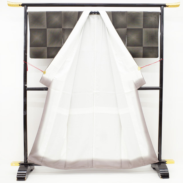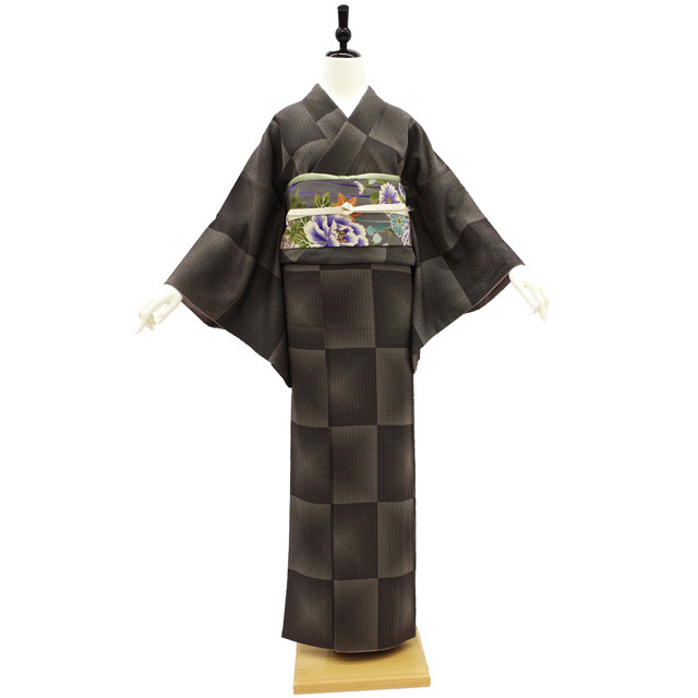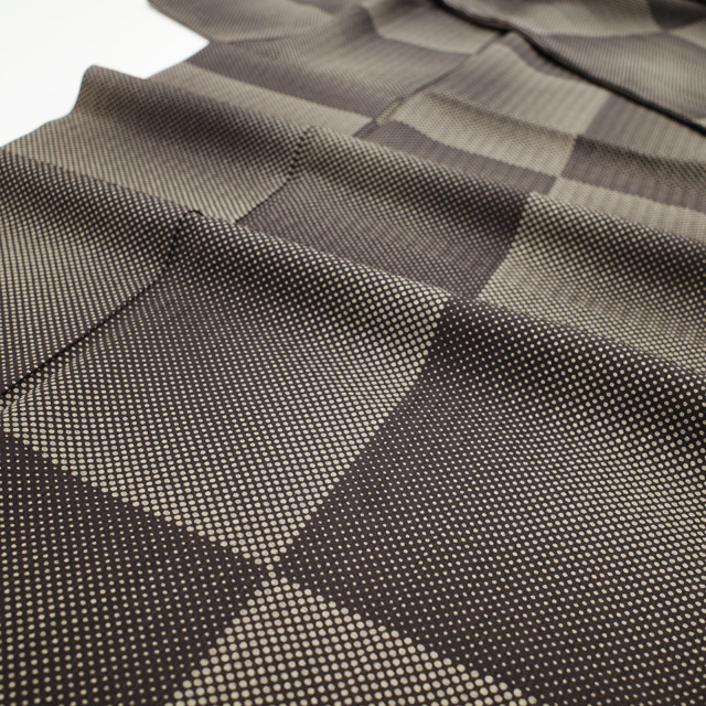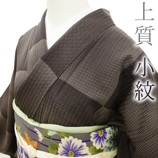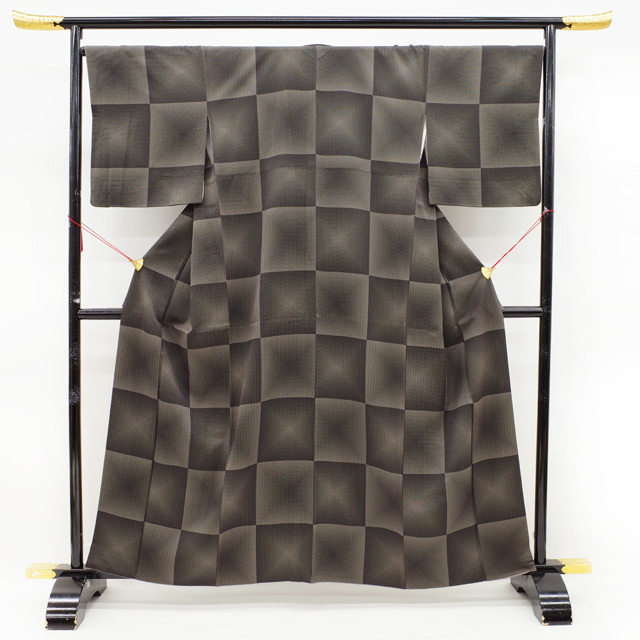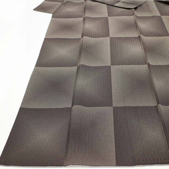 こちらのお着物は、ダークチョコレートブラウン色とベージュで市松に大小霰が染められています。