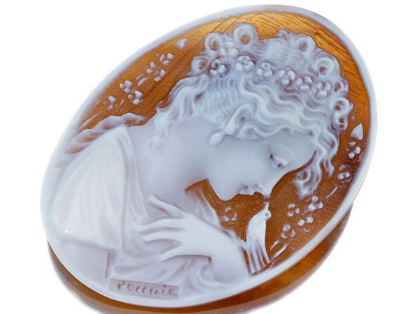 ラファエレ・ペルニーチェ作品!魅惑的な女性と小鳥の彫刻が魅力的なシェルカメオルースを特別大放出致します!