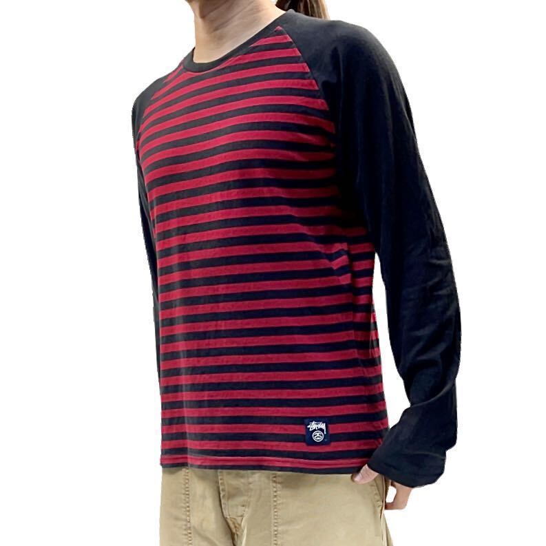 ラグランスリーブで身頃がボーダーになったシンプルなロンTです。