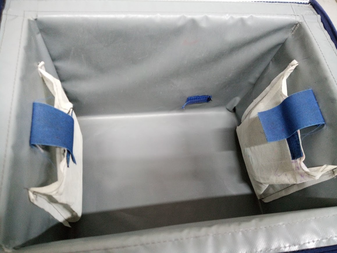 ・容量は不明です。内部のサイズはW35D25H22です。外側上部と外側前面にメッシュ袋が貼り付けられていますが破損しています。