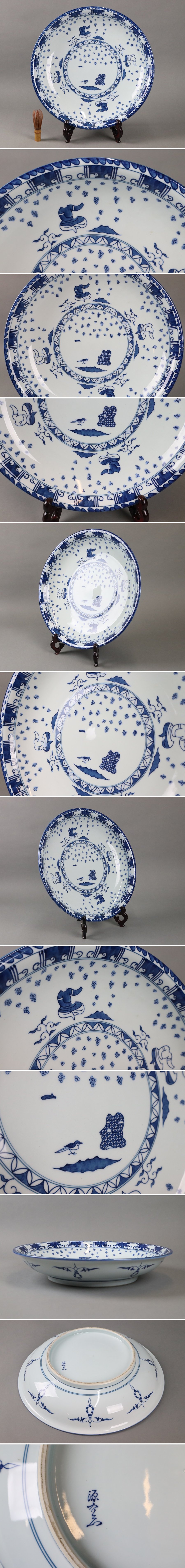 館林源右衛門 染付 大皿 直径44,5cm 飾皿 細密細工 古美術品[b1258]