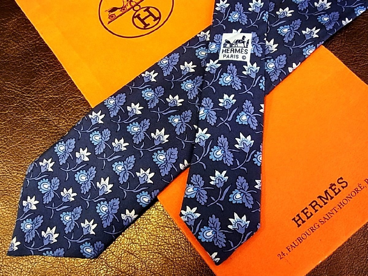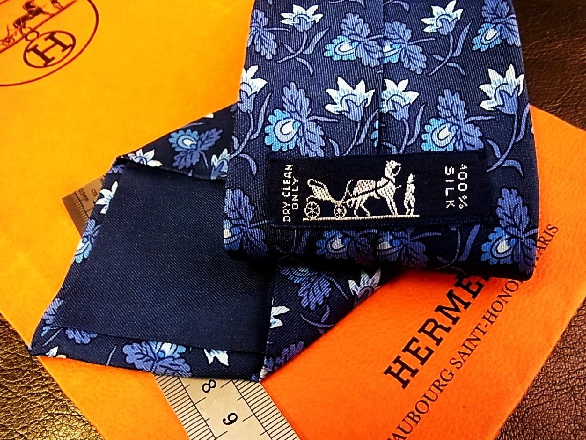 ★並品★4R01394【HERMES】エルメス「花 植物 柄」ネクタイ