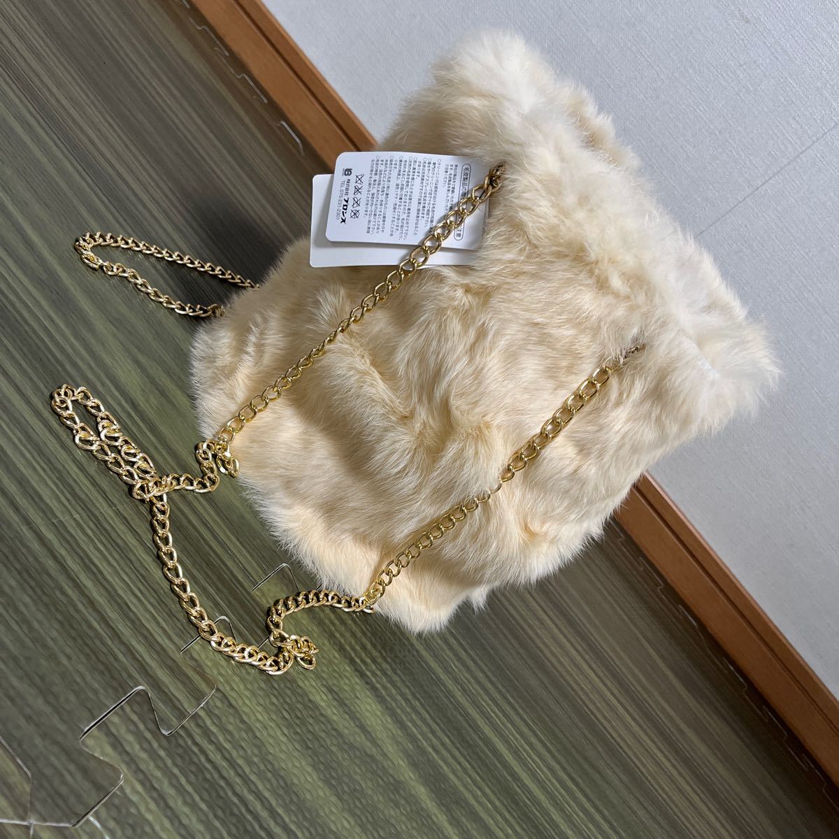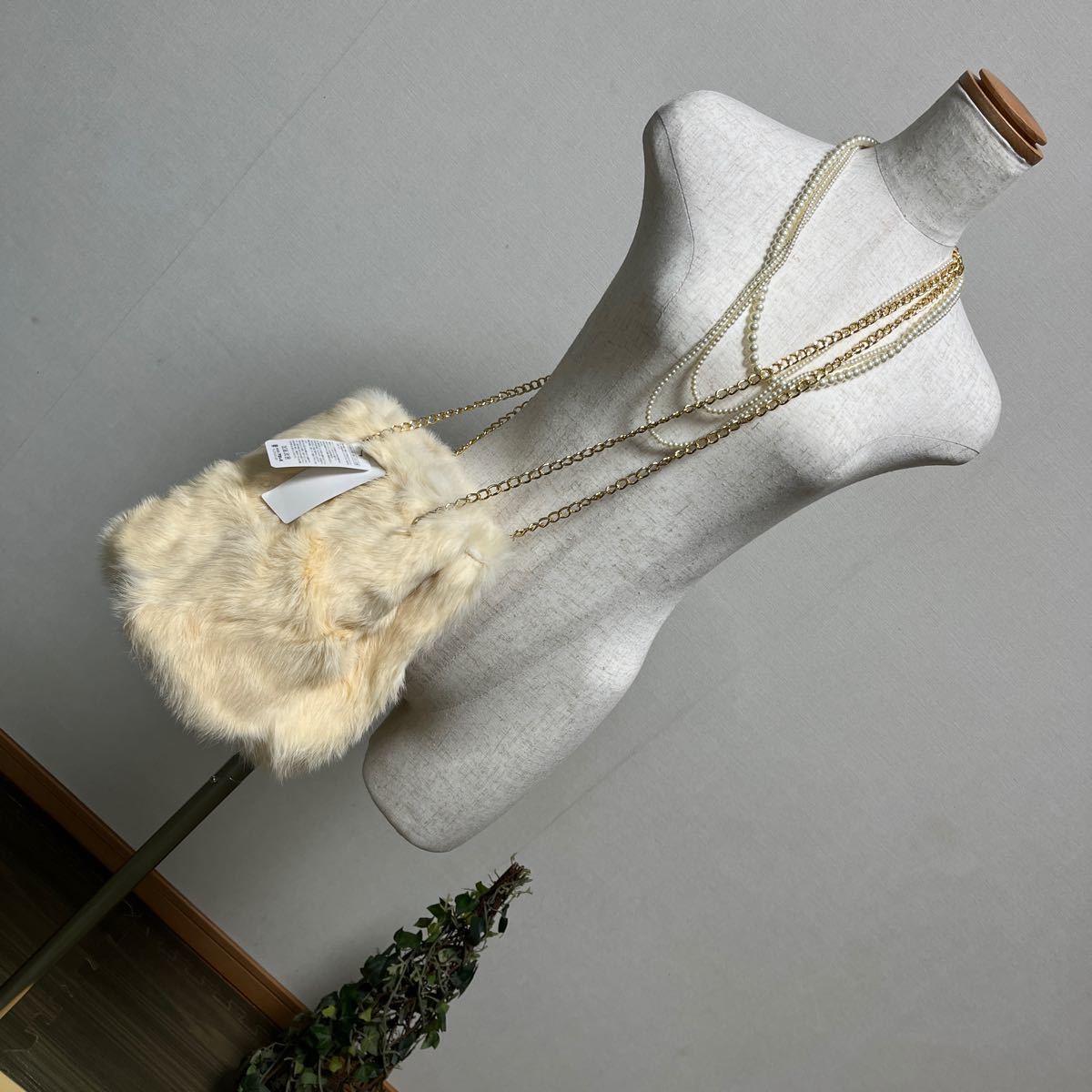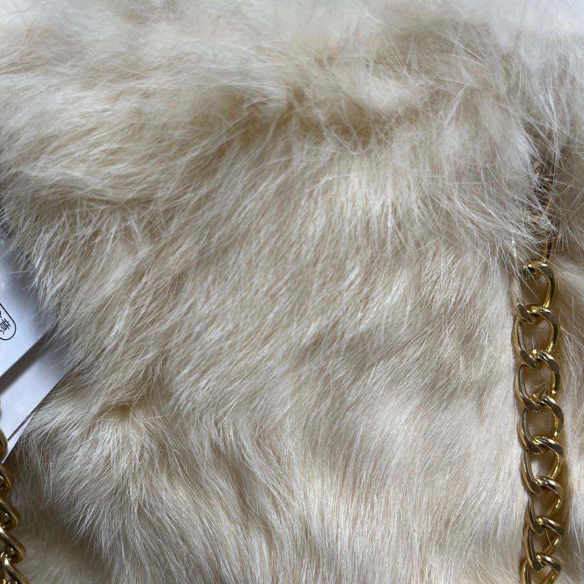 新品の華やかなふわふわなラビットファーポシェット♪ ポイントであしらわれたゴールドチェーンがコーデを上品で華やかにしててくれます。 縦長で柔らかい生地なのでスマホやリップなどの小物、収納力も◎ 普段使いもドレスにも合わせやすいです。底がまる型バケツ風デザインでとても可愛いです。トップスニット、ネックレスはついていません。
