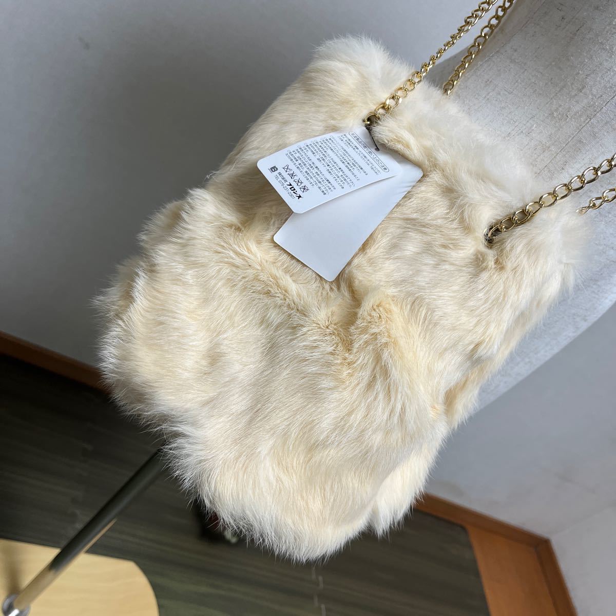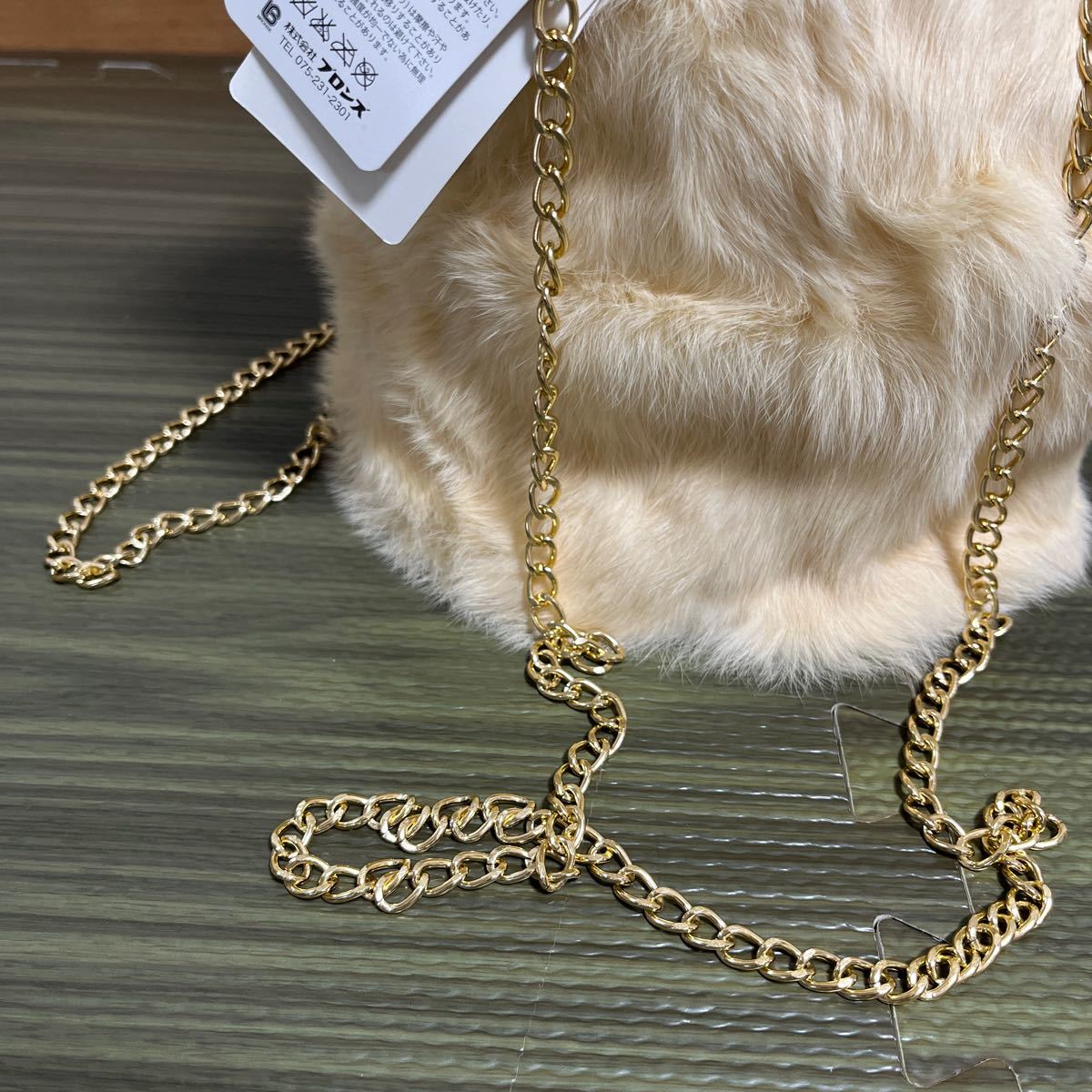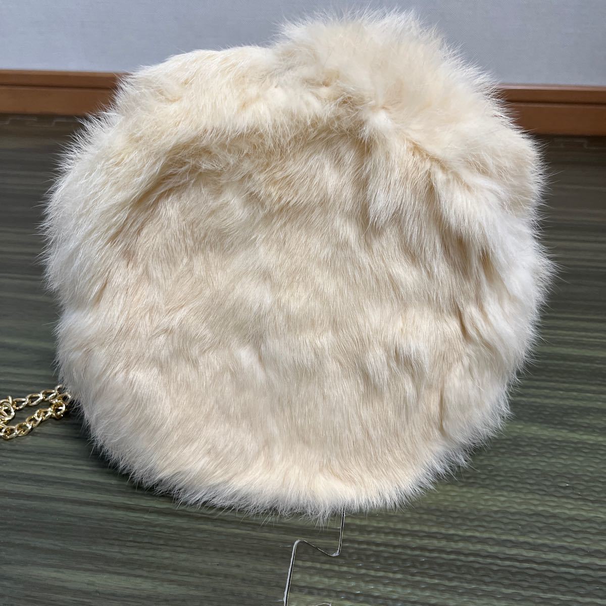 4-6新品 リアルラビットファーポシェット+ゴールドチェーン ラビットファー丸形バケツ型トートショルダーバッグ