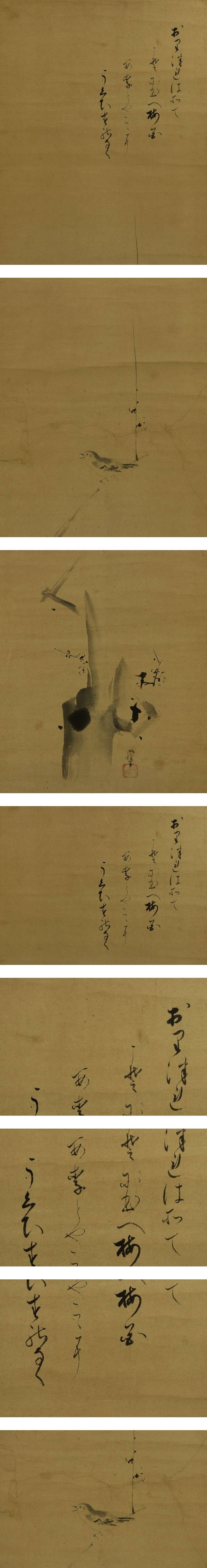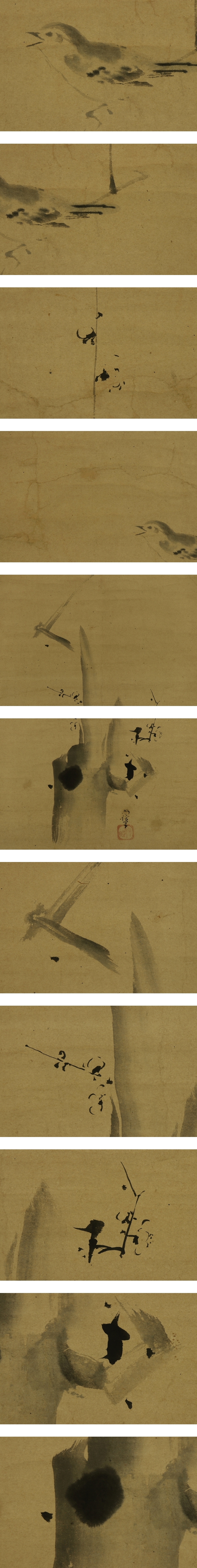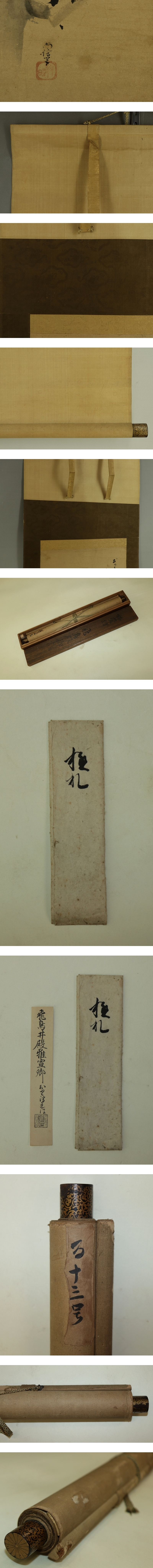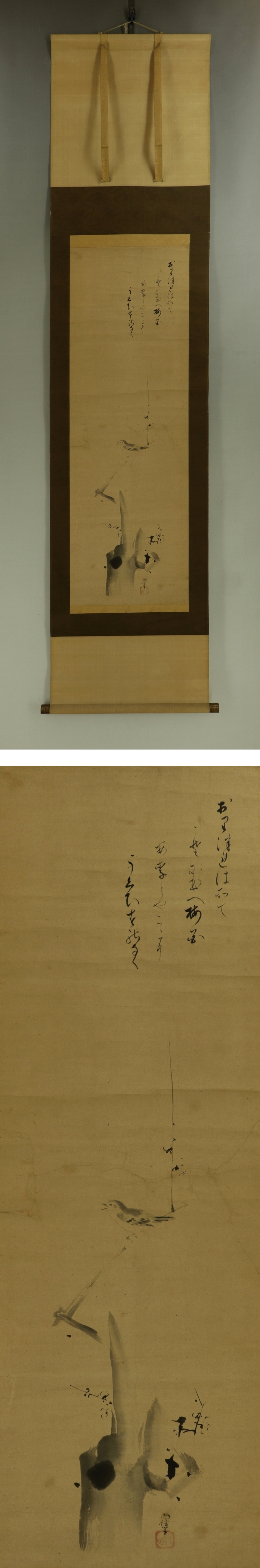 狩野尚信 かのう-なおのぶ(1607-1650) 江戸時代前期の画家。 慶長12年10月6日生まれ。狩野孝信の次男。父の跡を継ぐ。 寛永7年(1630)江戸にでて幕府奥絵師となり, 木挽町狩野家を開く。二条城,御所などの障壁画制作に参加した。 慶安3年4月7日死去。44歳。京都出身。通称は主馬。号は自適斎。 本紙は、染み、汚れ、強い折れ、皺、虫食いがあります。 表装は、染み、汚れ、折れ、皺、くすみ、虫食い、破れ、ほつれ、剥れ、軸先に擦れがあります。 【サイズ】 作品 横約32.5cm×縦約99cm 表装 横約43.5cm×縦約186cm |