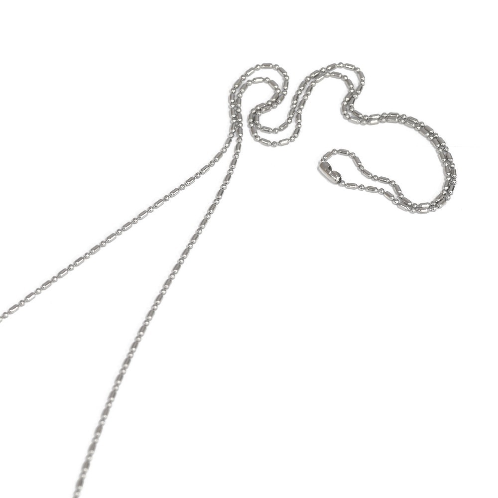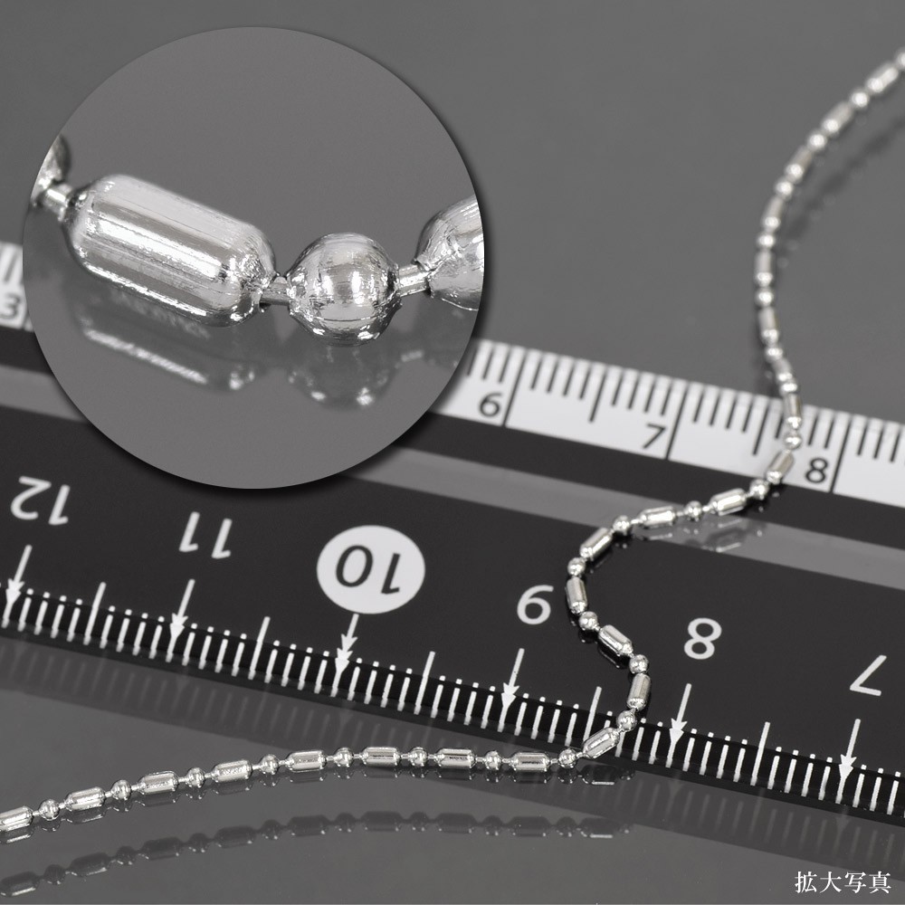 変形ボールチェーンは俵型のバーとボール(玉)が交互に連なり、通常のボールチェーンと比べるとアクセントのあるネックレスです。棒と球のパーツが連なるので(BAR×ROUND)、BRチェーンと商品名に付いております。こちらのチェーンの留め具はボールを筒状の留め具にはめるコネクタータイプなので、丈夫で壊れにくい、ペンダントに通し易い、留め具がデザインの邪魔にならない、ニッパーなどで切って長さの調整が出来る等、優れた特徴を持つ大変使い勝手の良いネックレスです。 ※こちらのチェーンは絡まりにくく万が一絡まってしまったとしても解きやすいデザインです。 |