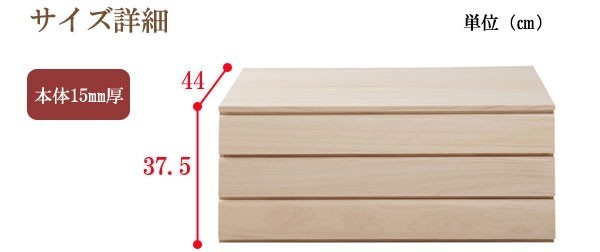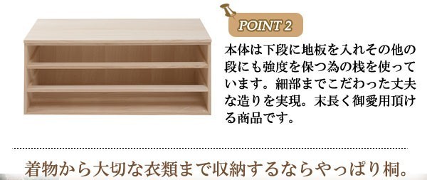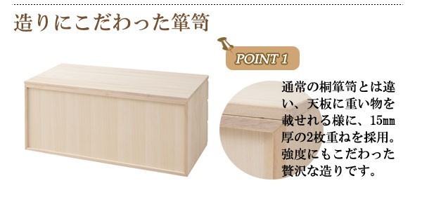 ◇通常の桐箪笥とは違い、天板に重い物を載せられる様に、15mm厚の2枚重ねを採用。強度にもこだわった贅沢な造りです。本体下段に地板を入れ、その他の段にも強度を保つ為の桟を使っています。細部までこだわった丈夫な造りを実現。末長く御愛用頂ける商品です。