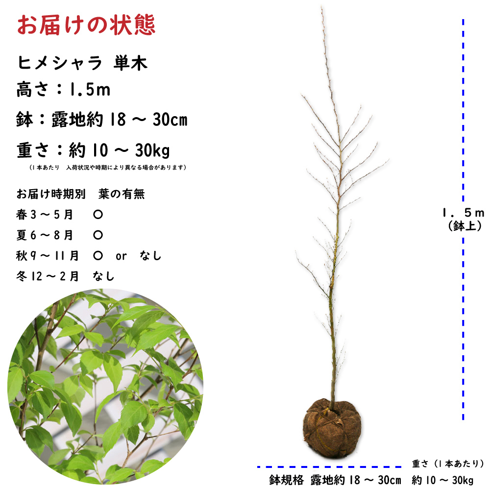 ヒメシャラの樹皮は滑らかで、淡赤黄色から淡赤褐色を帯びて光沢があります。幹がとても美しく有名な木です。日本三大美幹の1種です。秋には美しく広葉します。葉はほかの樹種より小さくどこか品があるように見えます。6~7月に小さく白いツバキに似た清楚な花をつけます。花はナツツバキに似ていますがそれよりも小柄です。実は9~10月につけます。シャラとの大きな違いは幹の色と葉の大きさと花の大きさが違います。