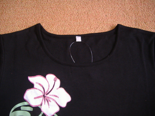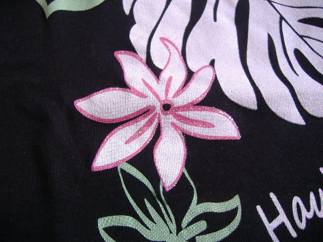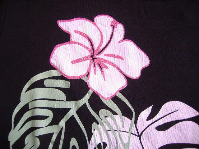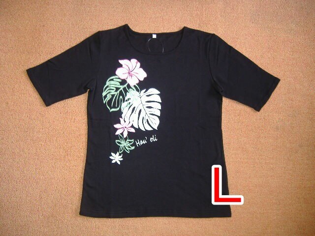 5分袖Tシャツ★ハイビスカス&モンステラ★黒★Lサイズ
