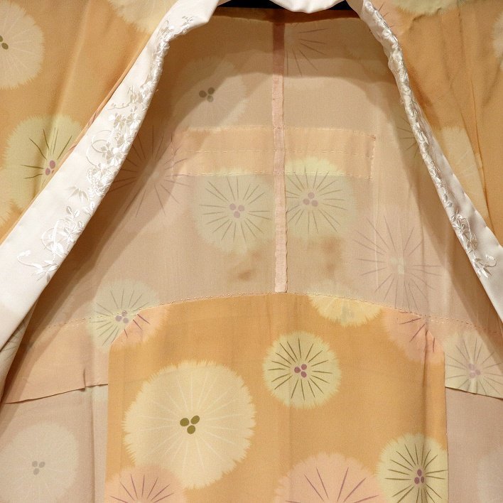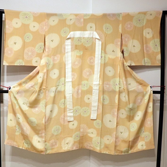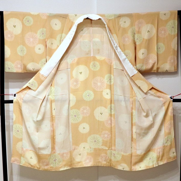 裄丈:約62cm、袖丈:約45cm、身丈:約116cm、うら背中しみあり、紐しみあり、襟汚れ、絹製。状態ランク:D