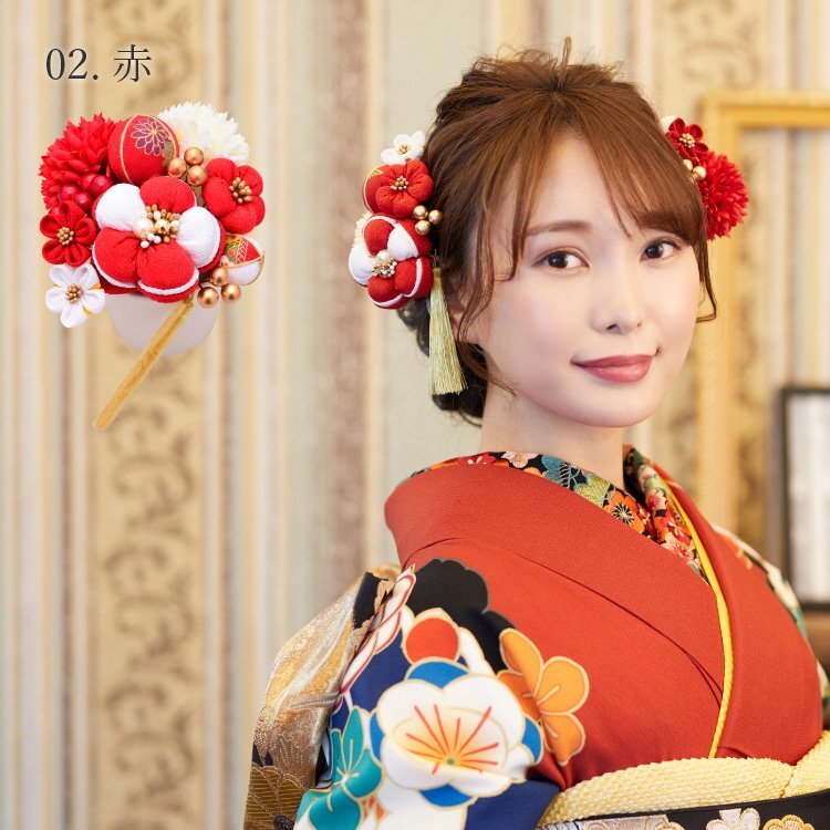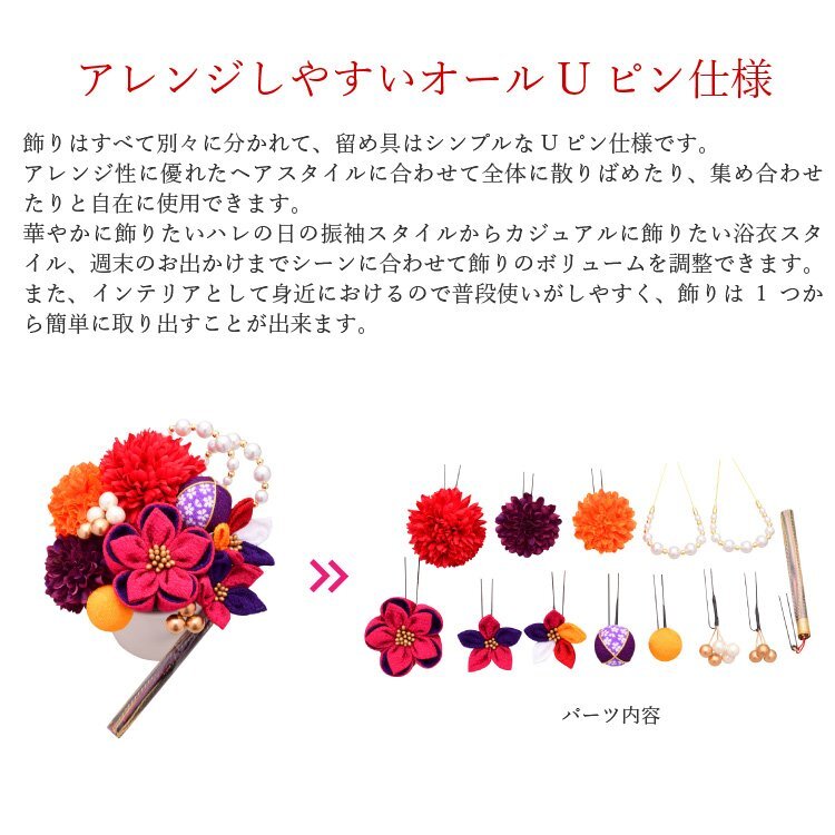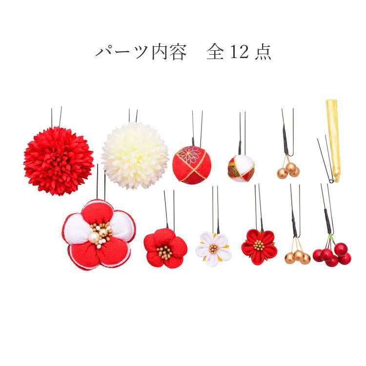 | 商品内容 | 髪飾り全12点 大花(綿入り)×1(花径6cm) 小花(綿入り)×1(花径4cm) 小花×2(花径3.5cm) マム大×2(花径6cm) ちりめん玉大×1(玉径3.5cm) ちりめん玉中×1(玉径2.5cm) 実玉5粒×1(玉径1cm) 実玉3粒×2(玉径1cm) タッセル×1(長さ7.5cm) |