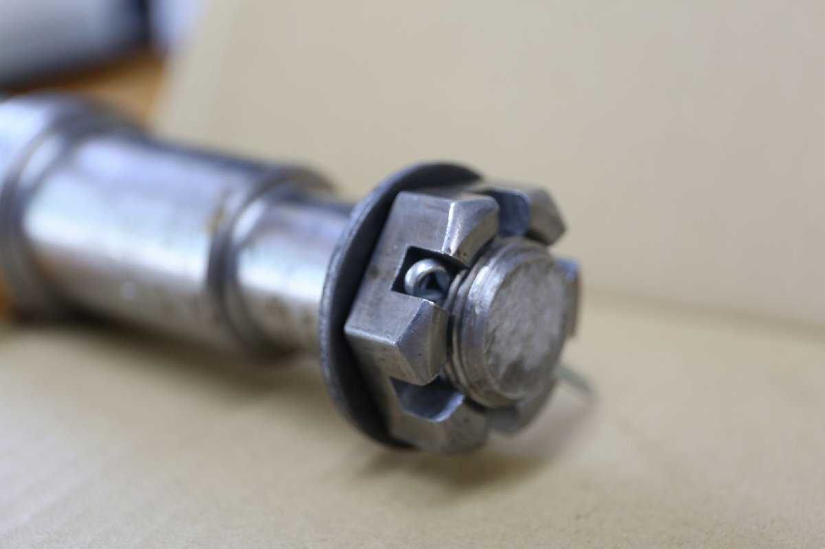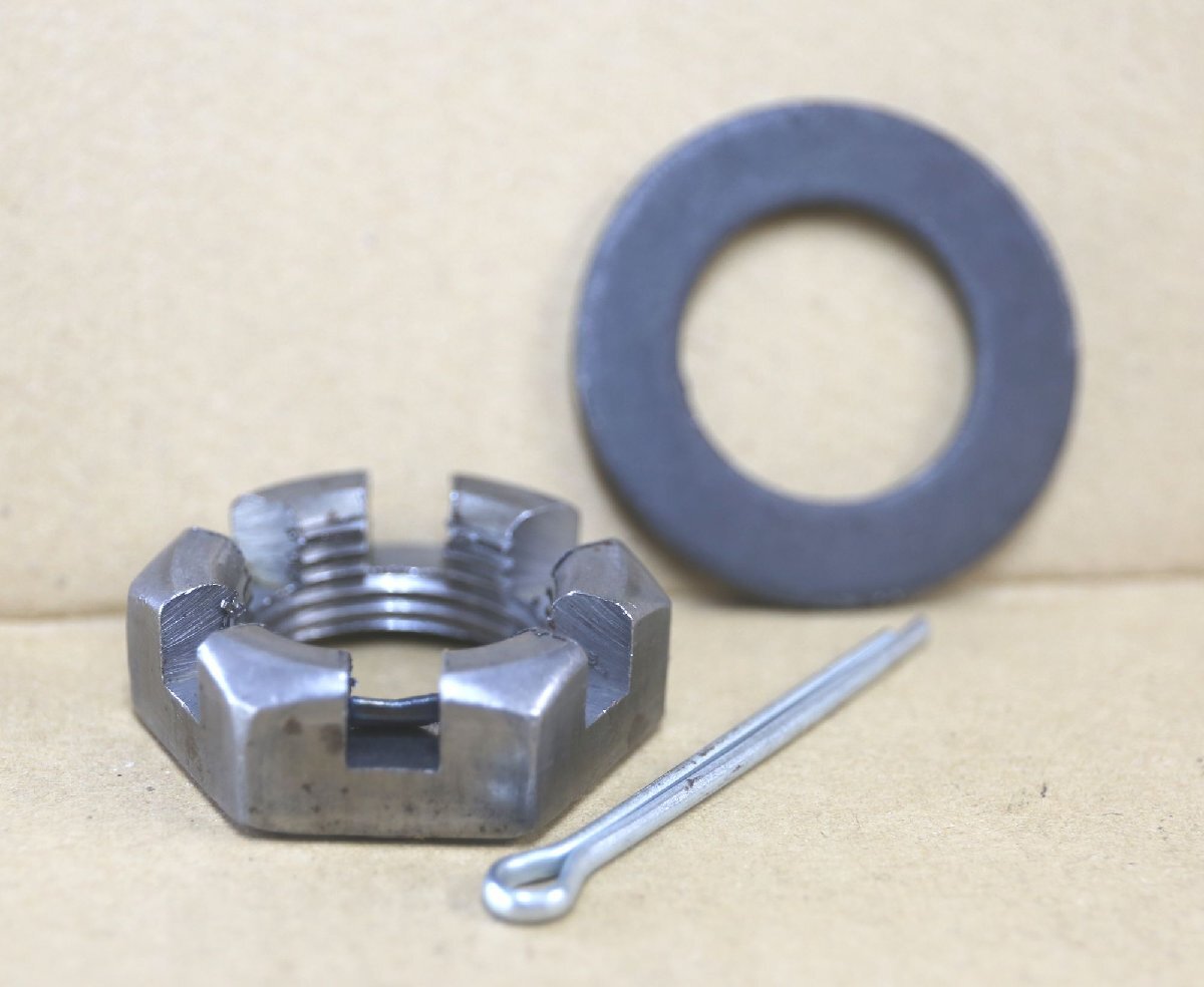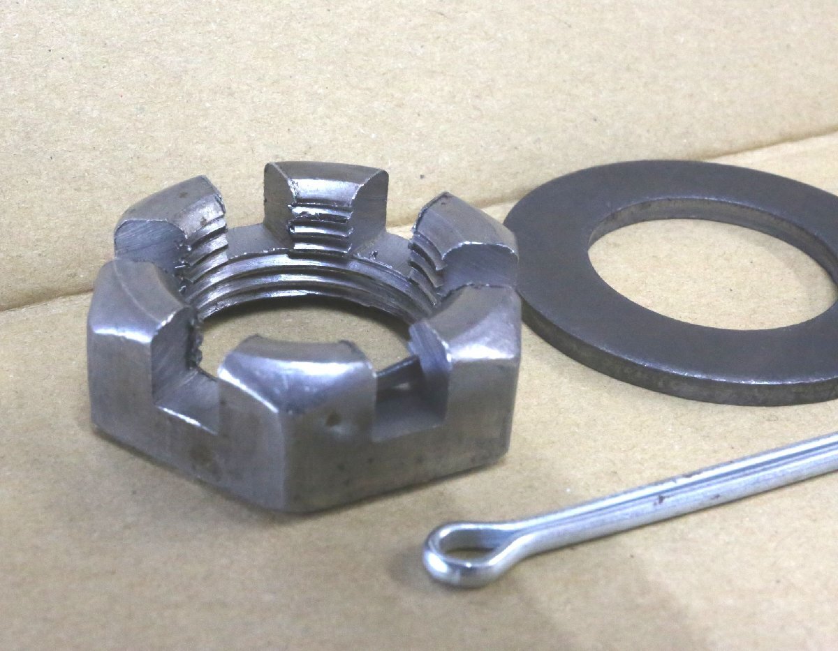 キャッスルナット、スピンドルナット&プレーンワッシャ&ピン 1インチピッチ14USA規格 トレーラー標準商品 6スロット内容 : ナット、ワッシャ-、ピン 各1個 (スピンドル別売り)レンチサイズ: 37.4 mm(1-1/2”)ID&Thread 1”-14 (インチネジピッチ14)内径:23.8mm
