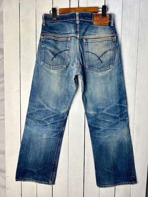 ●商品説明・・・90年代~00年代初め頃のオールドのブルーブルーのやや太めなの耳付きセルヴィッジデニムのデニムパンツです。リーバイスでいうと501XXのような501よりも太めなストレートの全体的なシルエットで、こちらはジッパーフライで、やや股上を浅くしたような感じです。加工では無い自然の、メリハリのあるアタリ・色落ち・ハチノスの入ったとてもいい雰囲気のデニムです。綺麗な色落ちが出ているからこそのお尻部分にタタキリペアなども入っていますがそれもいい風合いかと思います。日本製で、素材はコットンで、昔ながらのしっかりしたオンスの長く履いていただけるデニム生地です。サイズ表記は29で、S~M程度のサイズ感かと思います。バックのヨーク・ポケット口にステッチ飛びが見られたので、後に着用に問題が出ないように上からステッチかけてあります。