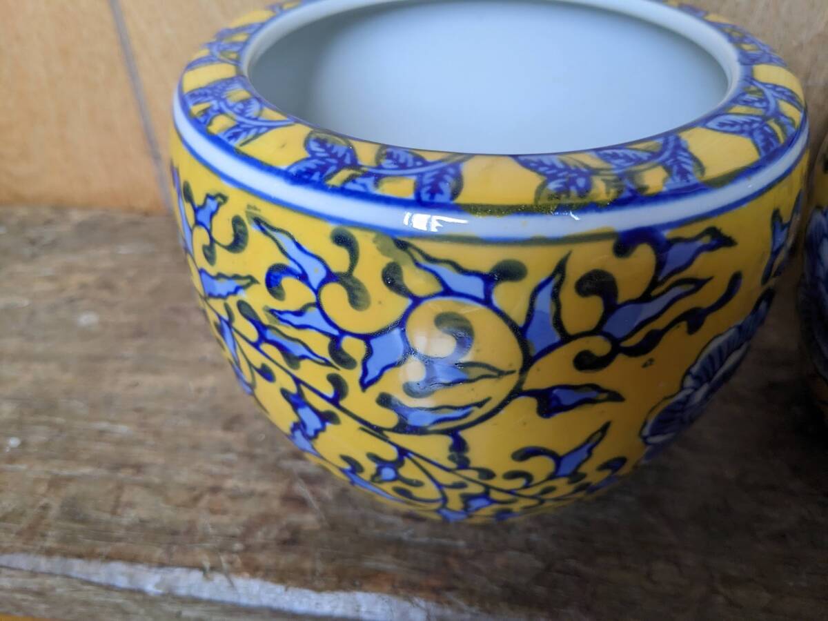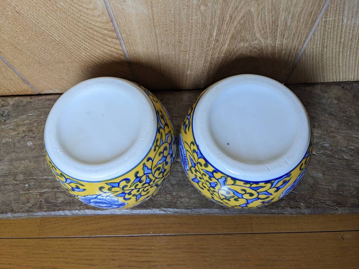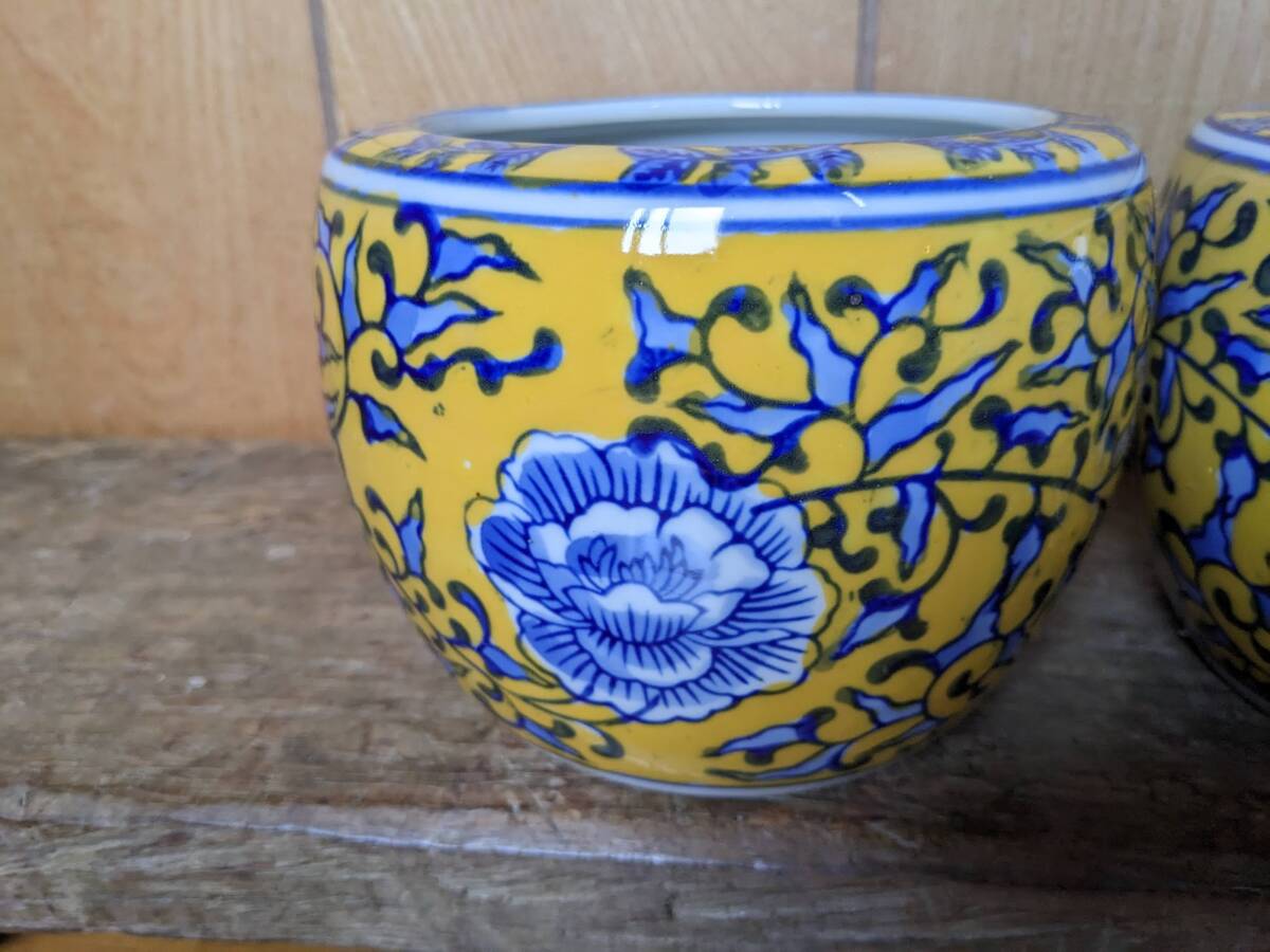 【お得な2個セット】3900円→3500円 2個で400円お得なセットです♪ 風水において、黄色は喜びや楽しみなどの明るい運気を引き寄せて、幸せを育む色です。陶器や自然素材で黄色を取り入れるとより金を強化するそうです。 「西に黄色」と金運アップでも有名です。西側に置くインテリアとしておしゃれにお楽しみいただけます。 やや小さいタイプですので、めだかや睡蓮鉢などにもいいかもしれません。インテリアとして水をはって浮き玉や水草を浮かべて涼を楽しんだり、ワインクーラーや鉢カバーとしてご利用いただいても素敵です。 雰囲気のある柄で骨董品や景徳鎮などの焼き物でもよく見かける絵柄ですが、 新品ですので骨董が苦手な方にお勧めです。 ※蚊取り線香を入れてみました。5インチの中には入るのですが、入口が小さくレギュラーサイズは斜めにしないと入らないため、ミニタイプ(3時間燃焼)のご使用をおすすめいたします。灰がたまって洗えるので便利です。 小1950円/個 サイズ(約) 5インチ 3号 直径13cm(内径入口 9.5cm) 高さ10cm ※写真と同等品を発送いたします。多少個体差がございます。 ※植物等はイメージ写真のため付属いたしません。 火鉢にはフチがあるので、浮き玉ははじっこに寄りやすいです。 商品の性質上、窯キズや黒い点や絵のはみだし・カスレ、突起、ピンホールなどが若干はじめからある場合がございます。