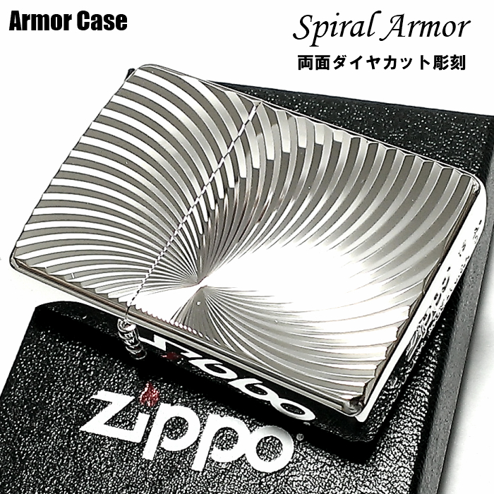 商品説明 | 【スパイラルアーマー ZIPPO】 重みのあるアーマーベースにスパイラル模様のダイヤカット彫刻を施したZIPPOライター。 角度の変化で非常に美しい輝きを放つ逸品です。 人気の両面同柄加工です。 アーマーとは従来のZIPPOより重厚で、金属の厚みがレギュラーモデルの1.5倍ございます。手にした瞬間にわかるその重量感は大変魅力的です。 プレゼントにもおすすめな非常に綺麗なZippoライターです。いかがでしょうか? |