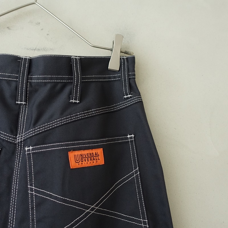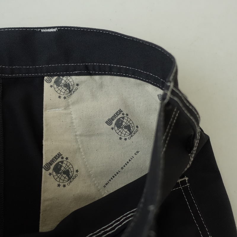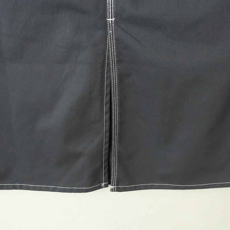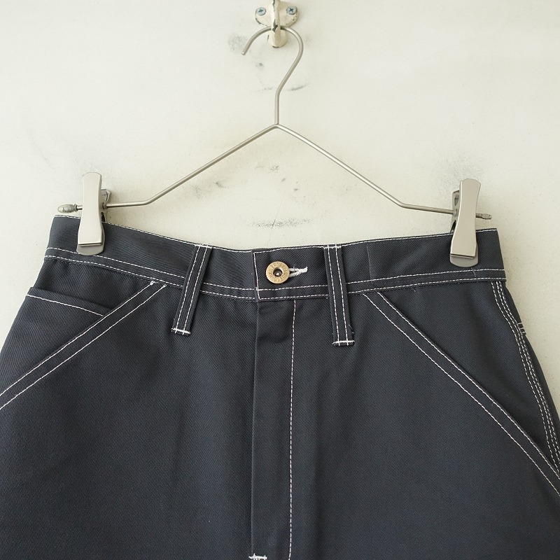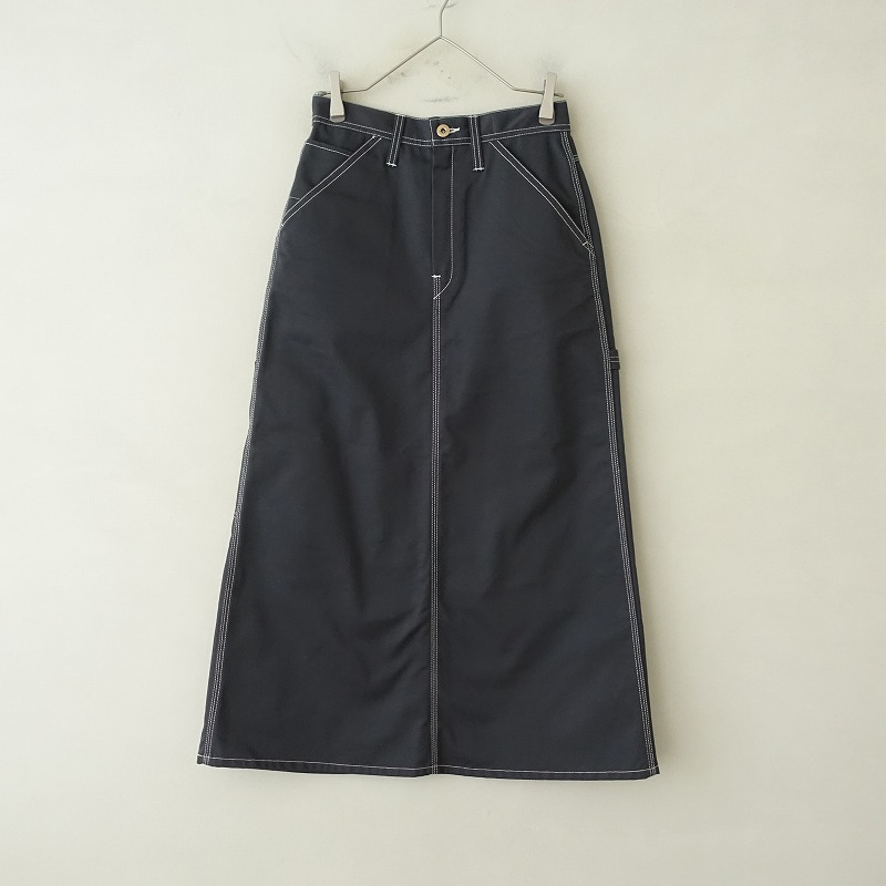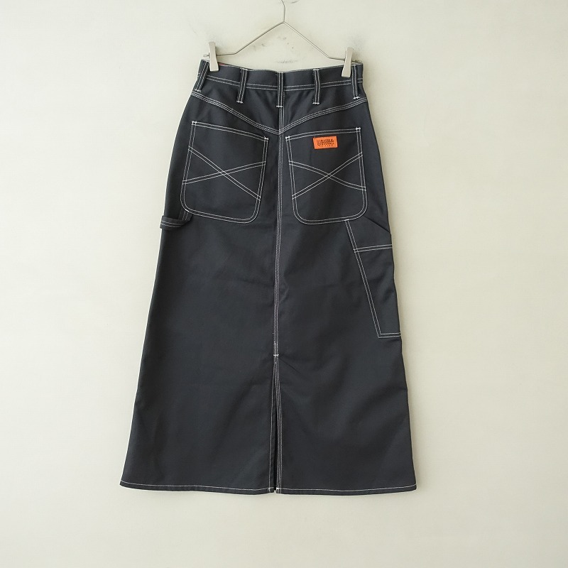 | UNIVERSAL OVERALLのぺインタースカートです。カラーはダークグレーで、ミシン糸はホワイトです。ややコシのあるツイル地で、フロントのボタン&ジッパーで着脱でき、バック裾センタースリット入りです。前腰左右(右コインポケット付き)&ヒップ左右&右太腿後ろサイドにポケットがあり、左太腿後ろサイドにループ付きで、裏地は付いておりません。 |