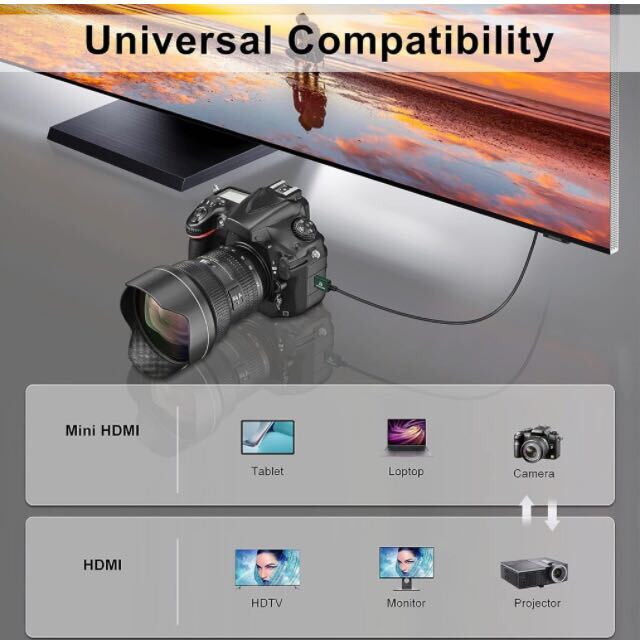 【高度な機能】: このミニHDMIケーブルは、最新のMini HDMI 2.0規格を満たし、4K@60Hz 2160P/1080P/720Pをサポートし、最大18Gbpsの帯域幅でオーディオ、ビデオ、写真を転送します。