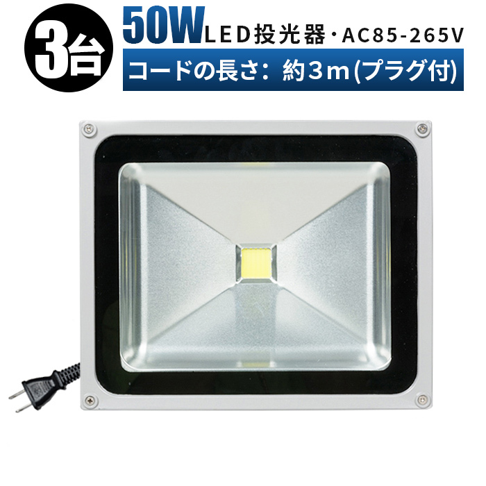 ●屋外や現場作業にも便利!商品型番 FL50W 入数 3台 LED Power 50w=ledチップ50w型×1pcs 対応電圧 85v〜265v 防水防塵 IP65 発光色 昼光色(6000-6500K) 配線長 約3.0m(プラグ付・スイッチ無) 本体 アルミ ダイカスト レンズ材質 超硬質強化ガラス (普通のガラスの4〜5倍の強度を持つ強化ガラスを採用、光線の透過率は大幅アップします透過率は98%以上に達する ) サイズ 233×285×140mm 配光角度 広角・拡散タイプ(120度) ルーメン 4500LM 保証期間 一年保証