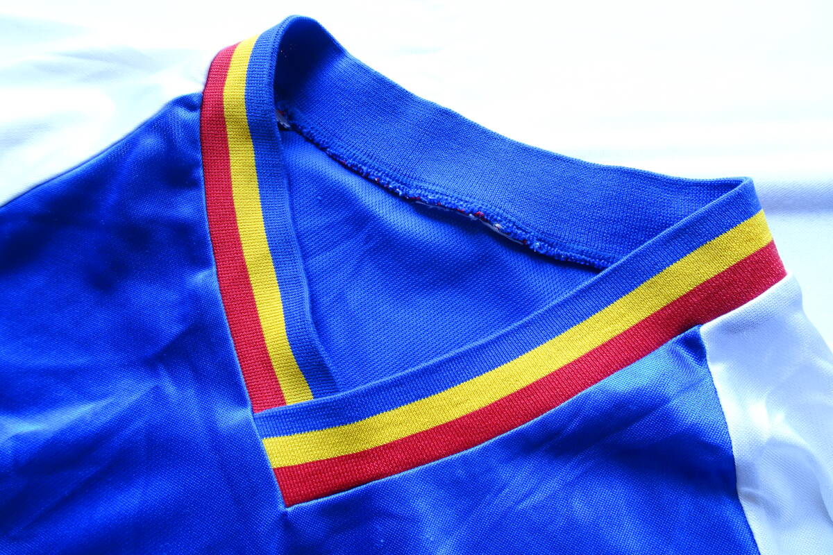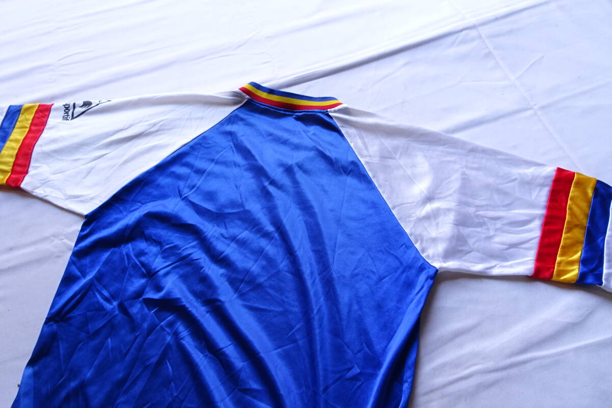 袖は白切替、袖口は青、黄、赤ライン切替です。