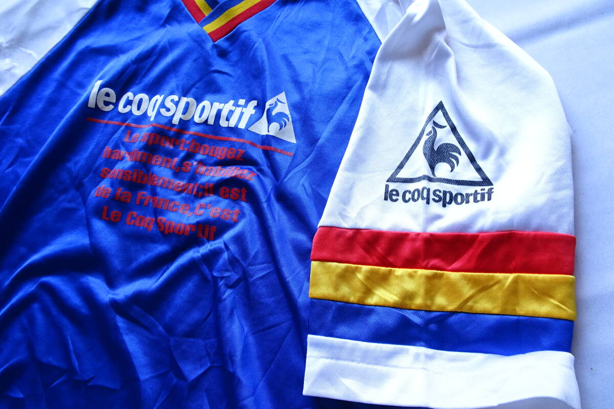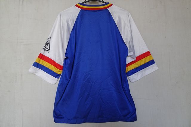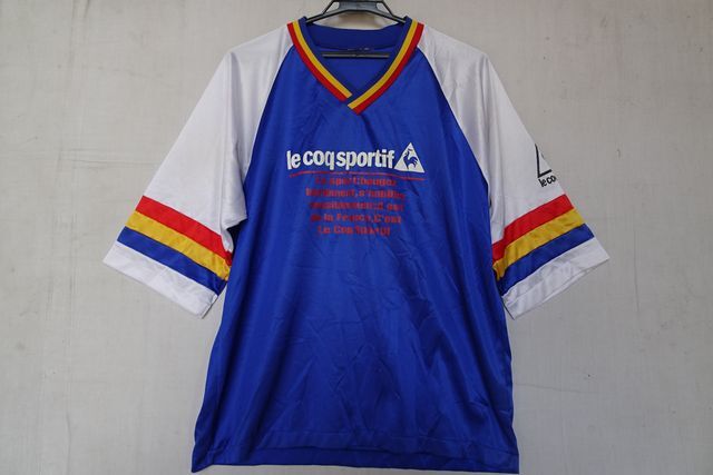 le coq sportif/ルコックスポルティフ/QS-0683/半袖Tシャツ/5分袖/光沢感/Vネック/青黄赤ライン/白/ホワイト/青/ブルー(5/2R)