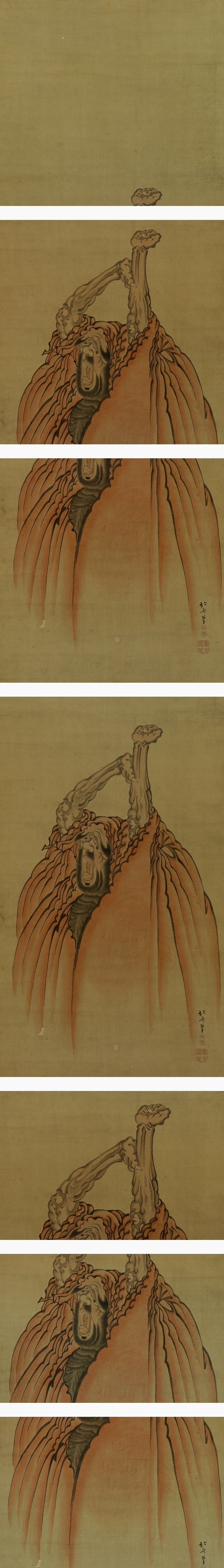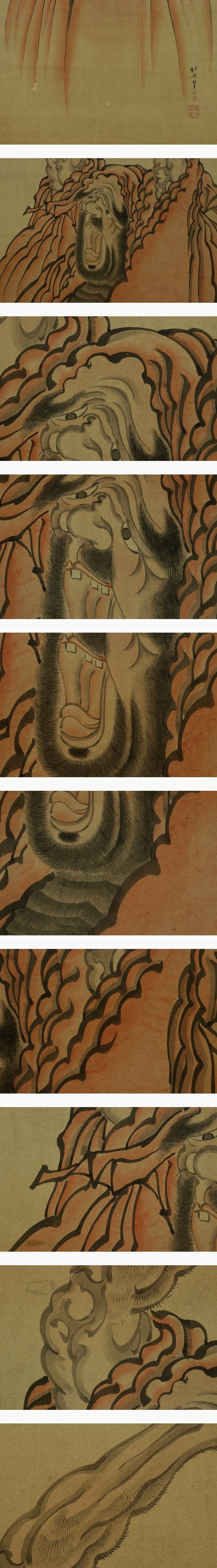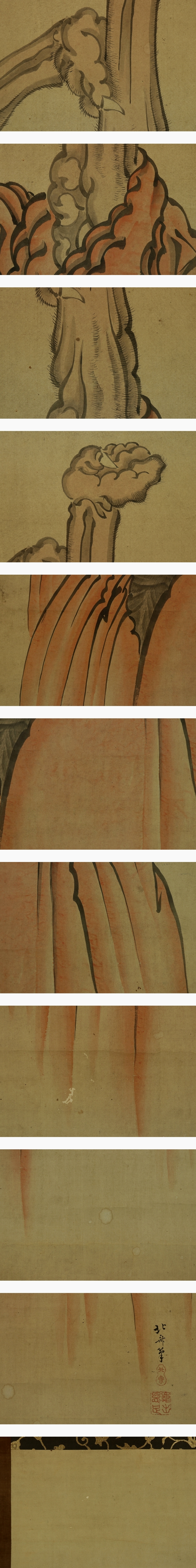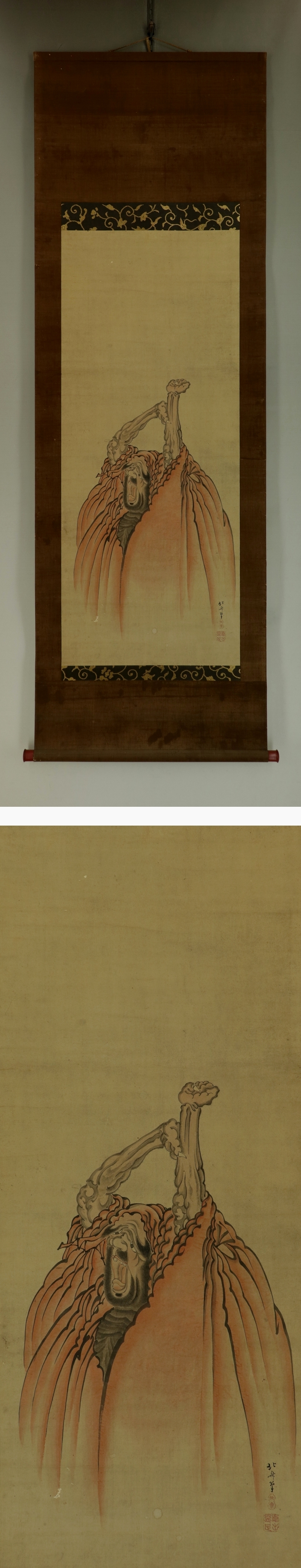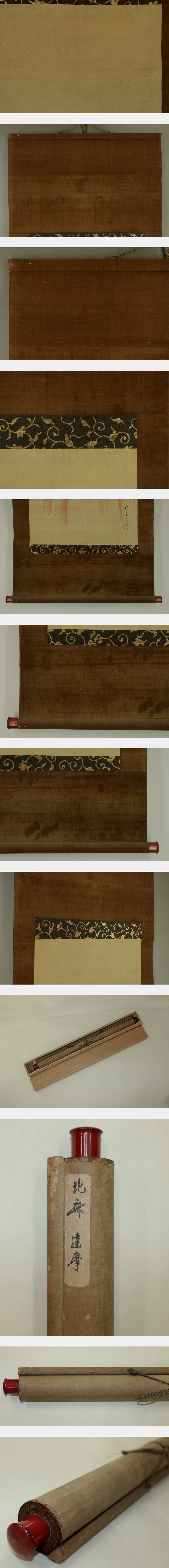 葛飾北斎 かつしか-ほくさい(1760-1849) 江戸後期の浮世絵師。葛飾派の祖。江戸の人。 本姓、中島。幼名、時太郎、のち鉄蔵。別号、春朗、宗理、可候。 勝川春章に師事して役者絵、美人画、絵本、さし絵などを描き、 さらに狩野派、土佐派、琳派や、中国風、洋風の画法を修める。 人間や自然を厳しく探求し、構成的で力強く、動きのある筆法により、 人物画や風景版画に独自の画境を達成。 その影響はフランスの印象派にまで及んだ。 本紙は、染み、汚れ、強い折れ、皺、虫食い、浮き、ヤケ、擦れがあります。 表装は、染み、汚れ、折れ、皺、虫食い、破れ、ほつれ、ヤケ、くすみ、 軸先に汚れと小傷があります。 【サイズ】 作品 横約45cm×縦約110cm 表装 横約58cm×縦約178cm |