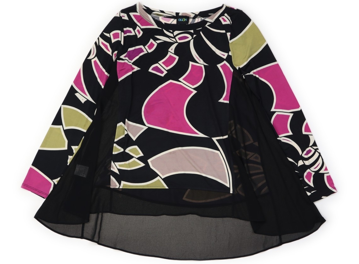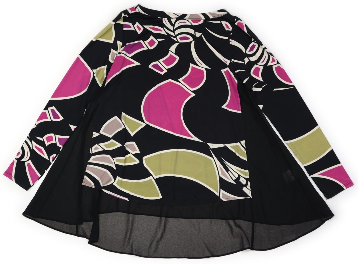実寸は、肩幅約33.5 cm、サイドネックポイントから総丈約74.3 cm、胸囲約46.8cm(×2平置き実寸)、袖丈約60.8cm。実際のサイズ表記はS。柄部分はポリエステル・ポリウレタンの薄手カットソー、無地部分はシフォン素材。前身頃にシミが多数見られ、両袖にもシミが見られます。右袖付け付近に部分的な毛羽立ちがあります。