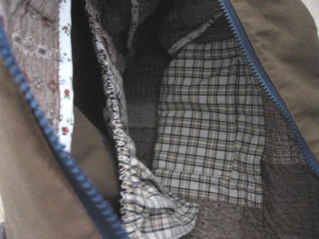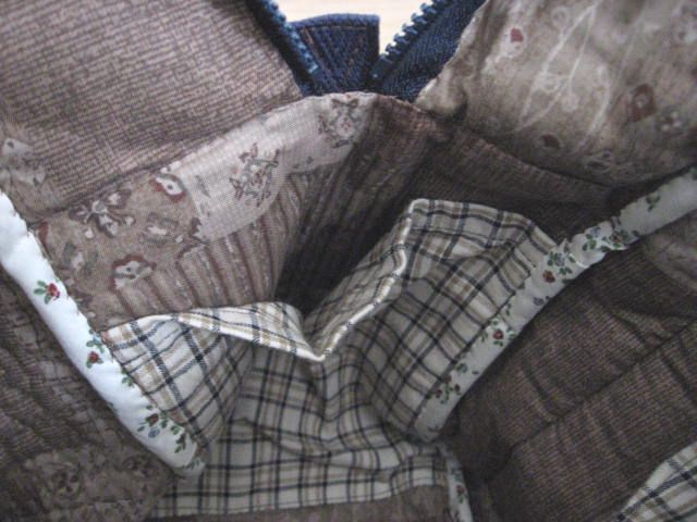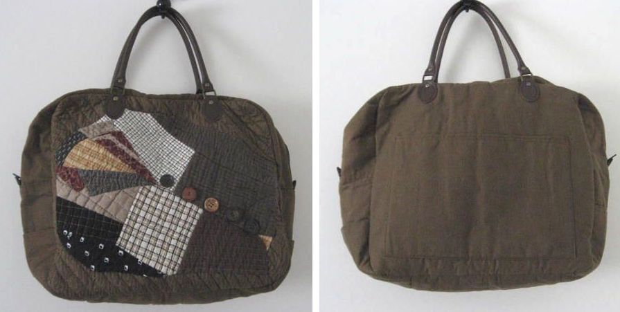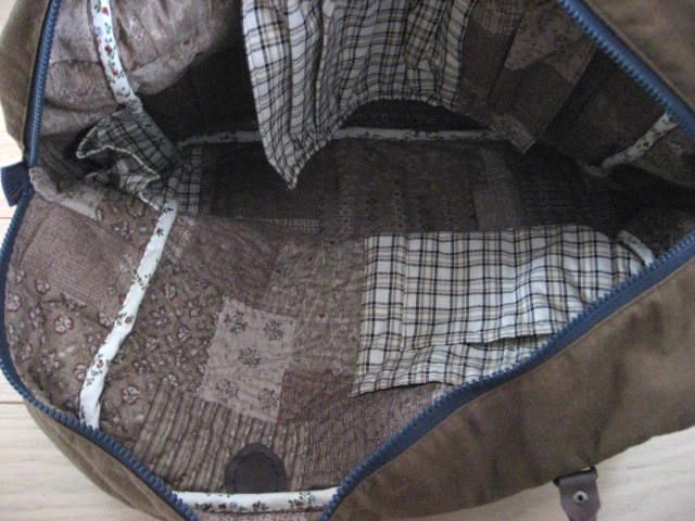 パッチワークのバックです。大きさは、(約)ヨコ:34㎝、タテ:30㎝、マチ:14㎝です。素材は綿100%です。色は、ブラウン系です。重さは、約470gほどあります。 ファスナーがある両サイドにポケットがあるのですが、左右ズレています。それ以外はキレイに仕上がっていると思います。 |