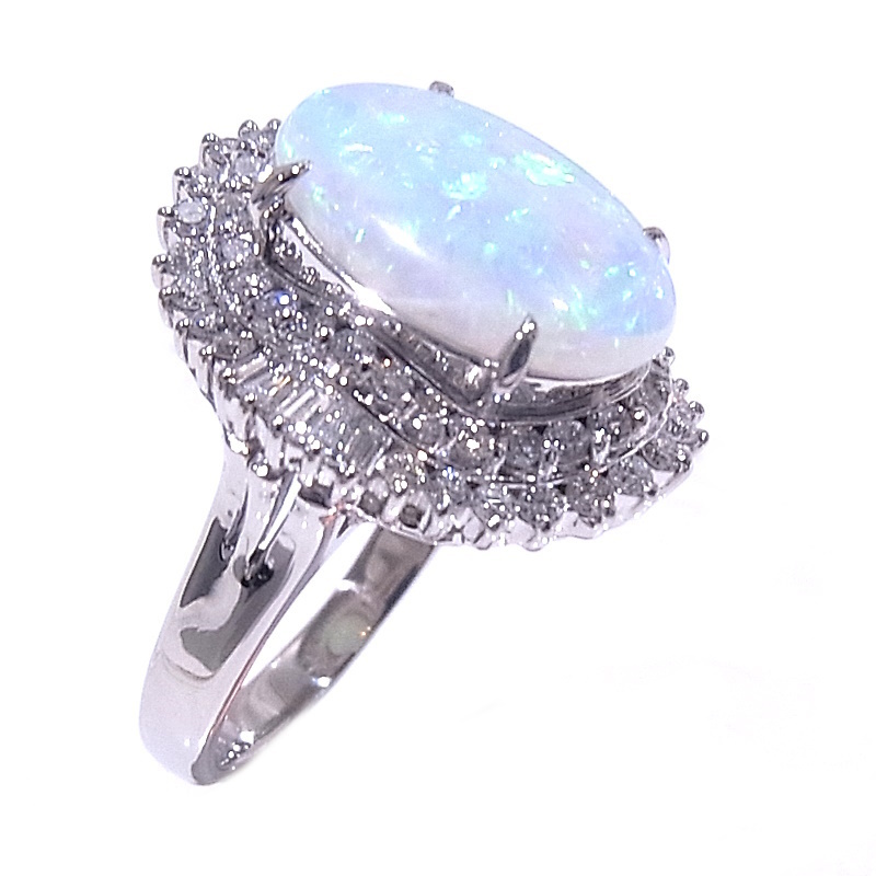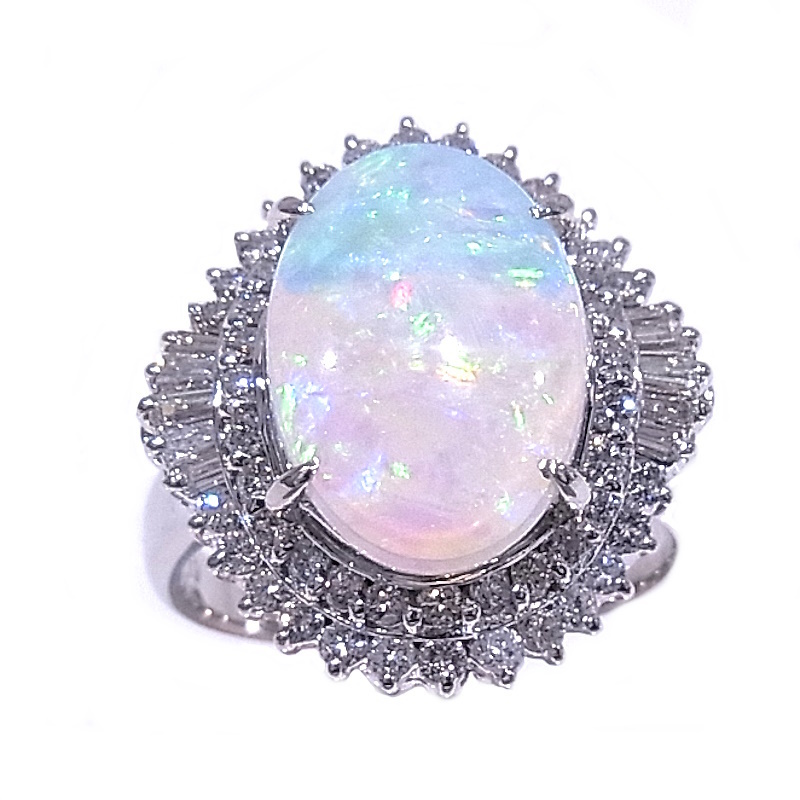 詳細・備考 | 乳白色をベースに、青、緑、オレンジなどの遊色効果が楽しめるオパールのリングです。脇石のダイヤモンドも大きめで存在感があります。 ■新品仕上げ済みで、きれいに仕上がっています。 ■店頭展示による微細な傷や、仕上げで取りきれなかった傷が残っている場合がございますが、その点はご了承ください。 |