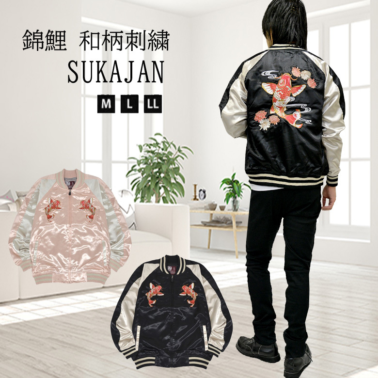 錦鯉 和柄刺繍 サテン スカジャン 本格 和柄刺繍 スカジャン 30-1481z JAPAN 新品ブラック L