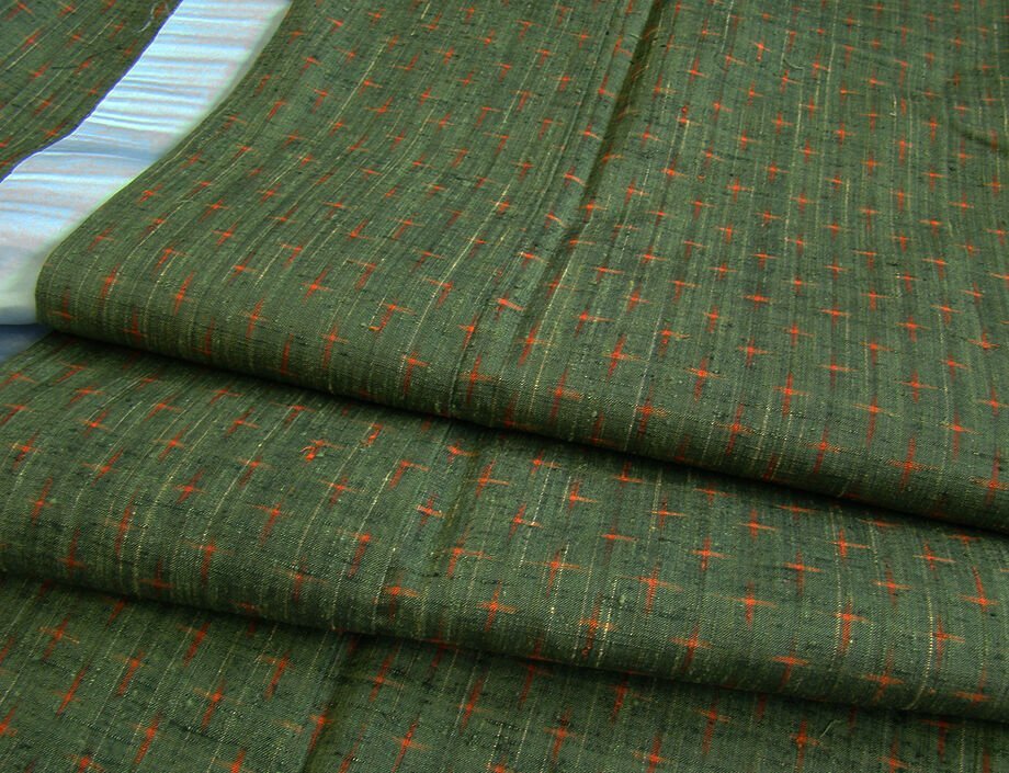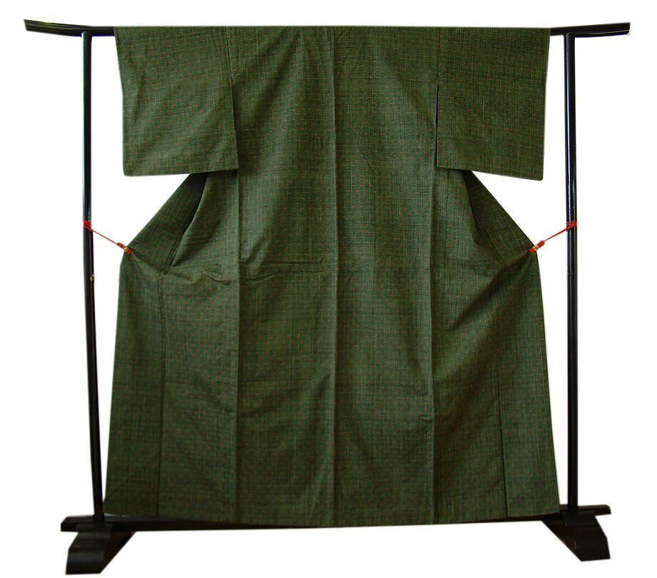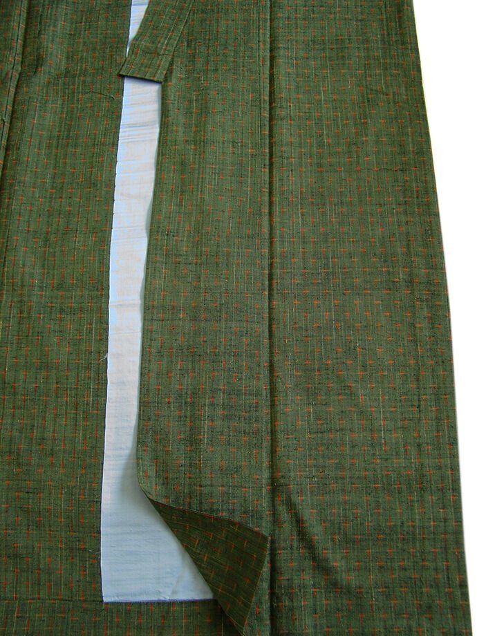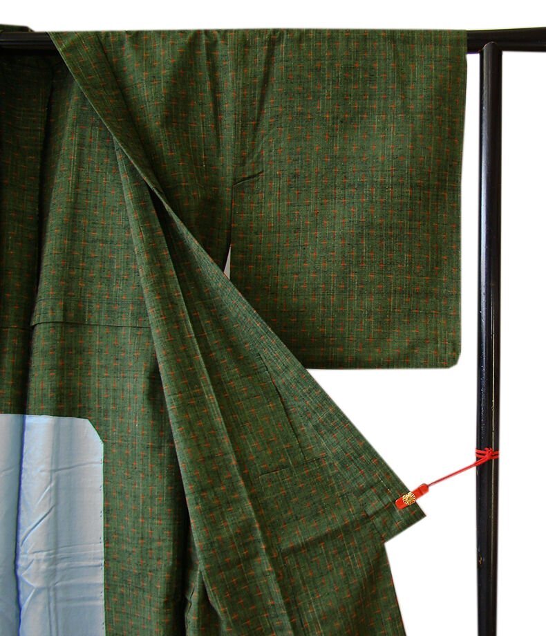 商品説明 | こちらのお品は「単衣」ですので5月、6月、9月にお召頂ければと思います。 着物には、大きく分けて「袷(あわせ)の着物」と「単衣(ひとえ)の着物」と「夏着物」があります。 反物(表地)を着物に仕立てるときに、裏地類をつけるものを袷の着物、 つけないものを単衣の着物と呼び、胴裏や八掛といった裏地がつかない一枚ものの着物です。 また裏地がないため、座る時などにヒップのラインが目立たないよう、 居敷当て(いしきあて)の生地をつけることもあります。 正絹の居敷当て1巾付いております。 しなやかなさらりとした風合いが着心地良い単衣の紬地、 渋いオリーブグリーン色地に橙色の織柄となっております。 また、バチ衿仕立てとなっております。 |