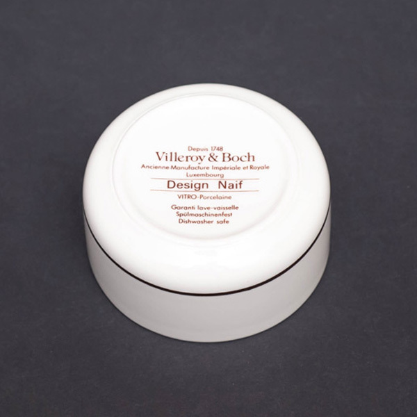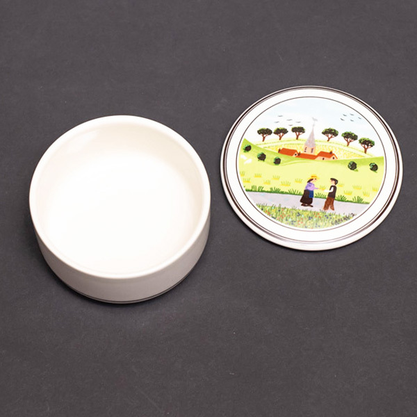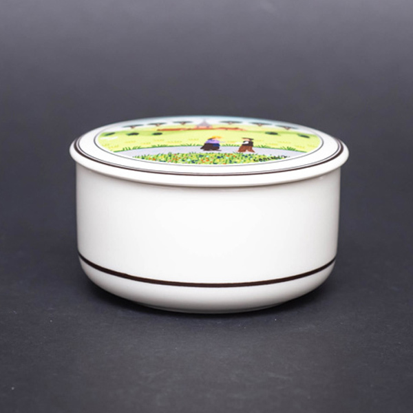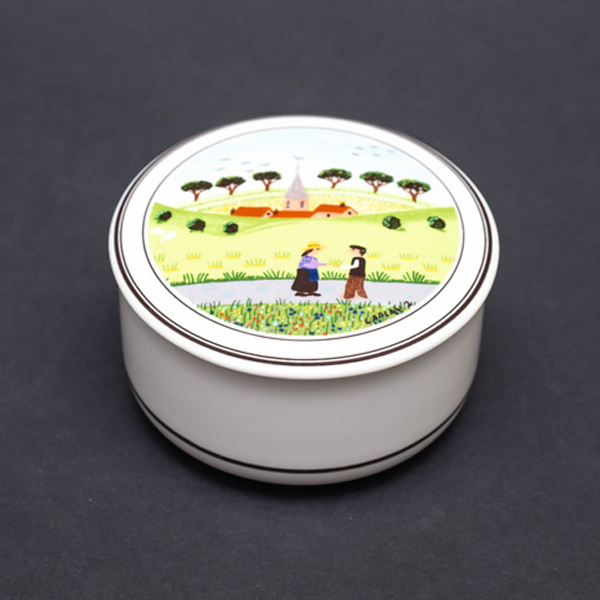 ビレロイ&ボッホのデザインナイーフ (ボーイ&ガール)のキャンディボックス。 "ナイーフ"とは"素朴派"という意味で、ヨーロッパの人々の生活や風景を素朴なタッチで描いた、絵本のような特徴のシリーズです。1978年にまだ無名だった画家ジェラルド・ラプロのクリスマスカードがビレロイ&ボッホの役員に届いたことのがきっかけでスタートし、現在まで長く愛されるシリーズとなっています。電子レンジ、食洗機どちらも利用可能です。『ボーイ&ガール』と題されたこちらのキャンディボックスは、少年と少女が道端で会話しているところが描かれています。 ■サイズ 直径79 × 高さ47mm ■付属品 なし ■状態 B(良品):特に目立つダメージのない、状態の良いお品物です。 |