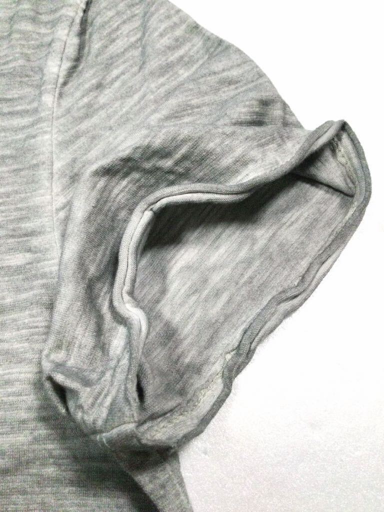 首周り・袖口・裾といった生地端(ヘム)はカットオフ仕様で、洗い加工によってロールされたようになっています。