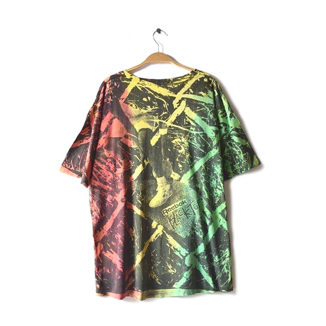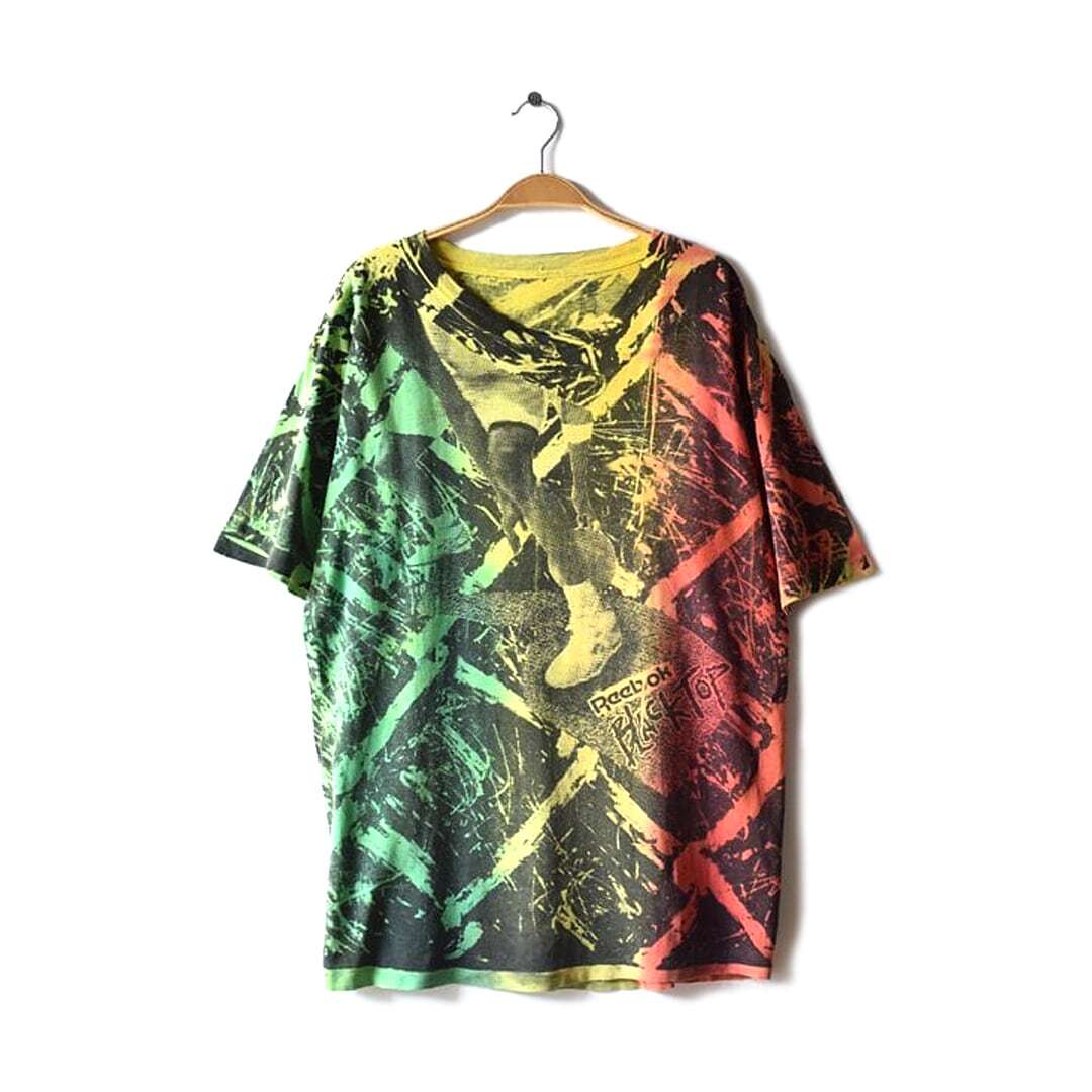 【送料無料】 90s リーボック BLACKTOP 総柄プリント ラスタカラー ヴィンテージTシャツ REEBOK XL相当 古着 @BE0018