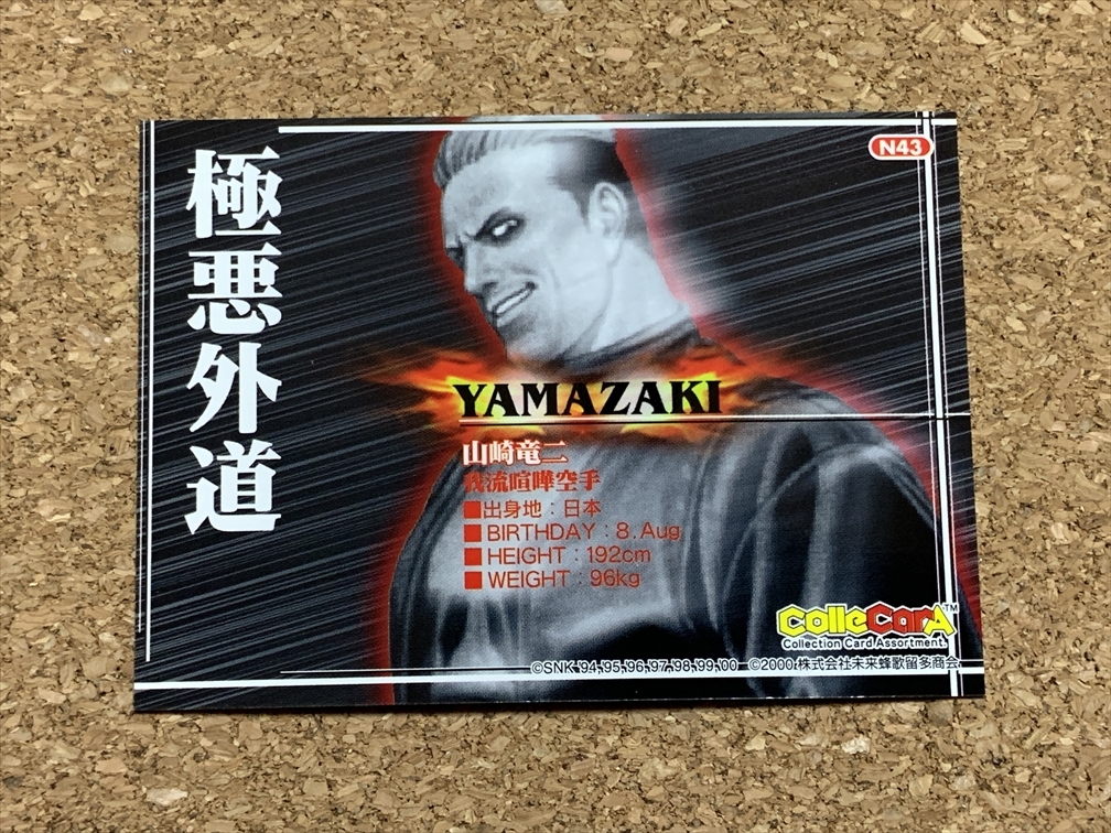 SNK 系 グッズ(トレカ) 「ColleCarA THE KING OF FIGHTERS MILLENNIUM N43 YAMAZAKI(山崎竜二)」 を コレクション縮小につきダブっている物から出品します。  発売から長期経過した商品は、私の記憶違いや勘違いで収録パック弾数等 誤表記があるかもしれませんので、絵柄(デザイン)・キャラクター・ナンバリング・レアリティ 等 重要な部分は必ず写真をご確認ください。
