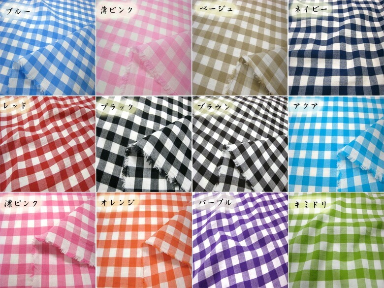 定番人気のチェック柄、ナチュラルな風合いや、ワッシャー加工のシワ感など、こだわりの生地で、カラーもお薦めのカラー12色展開です。チェックの大きさは約1.4cmの大きさ、厚みは薄~中程度のほどよい厚みですので、洋服やカバーなどのインテリア類、小物など様々な作品にお使いいただけます。