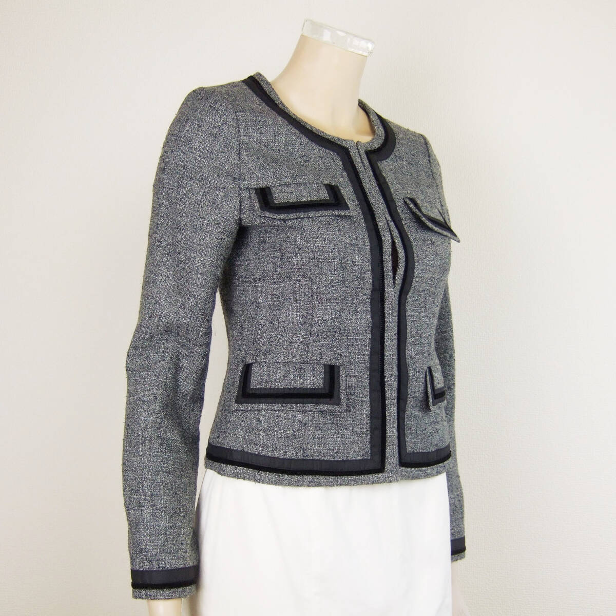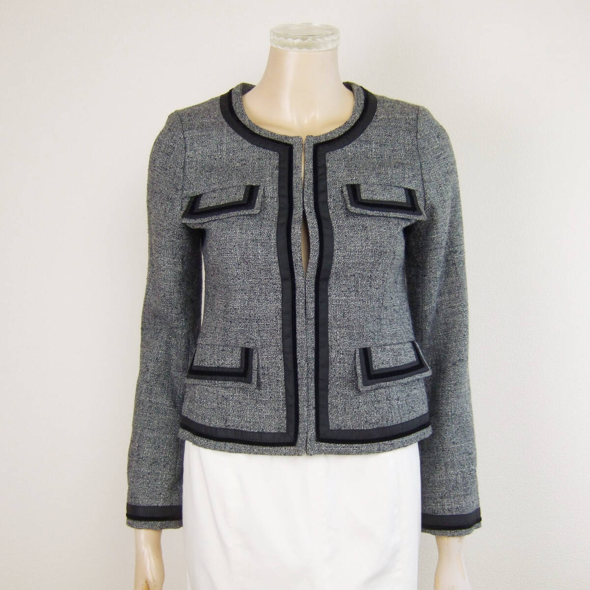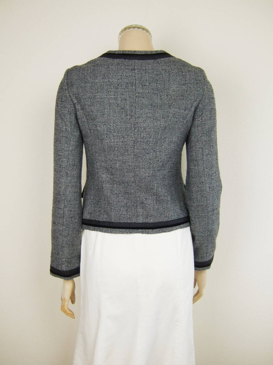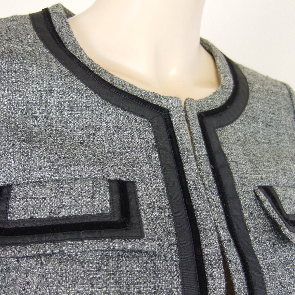 特徴:スクエアーポケットが印象的ツイードジャケットです。僅かなシルバーラメ入りツイード、艶リボン&ベロアトリムの美形ノーカラージャケットです。 ---↓ここにサイズ記入----
